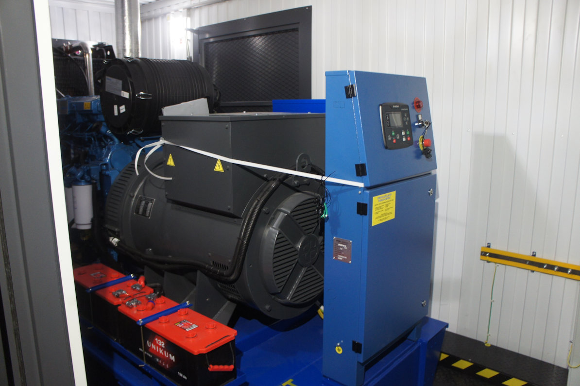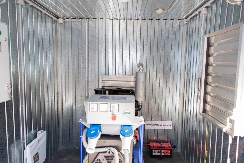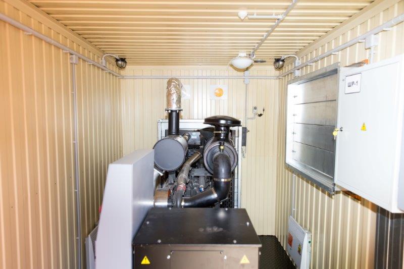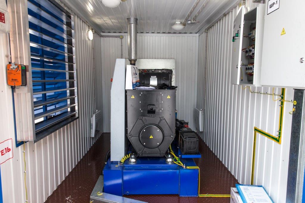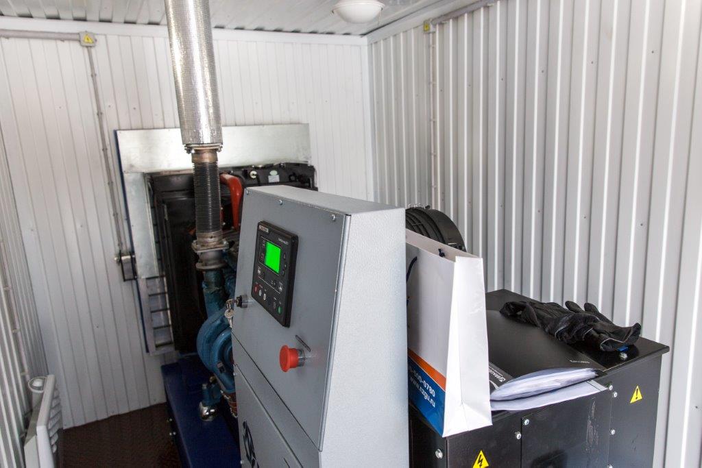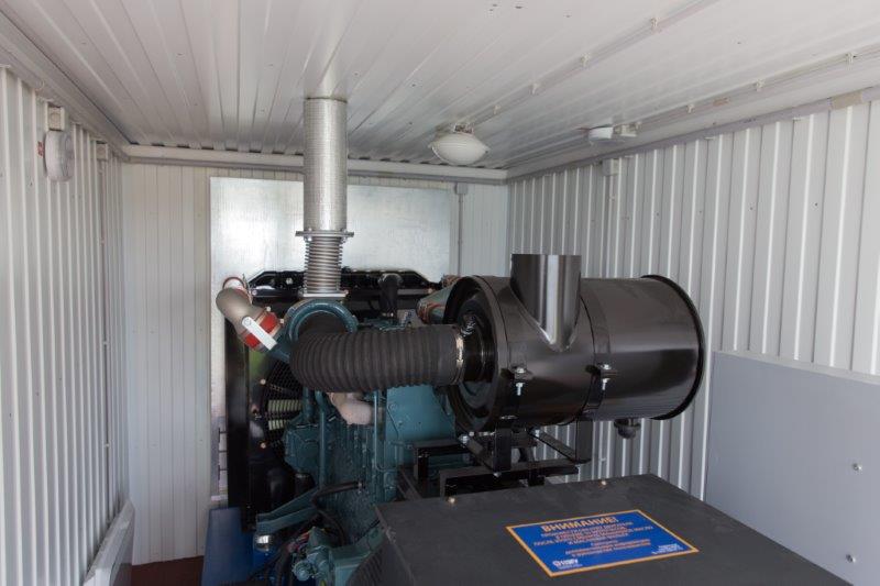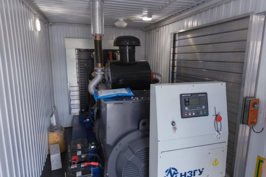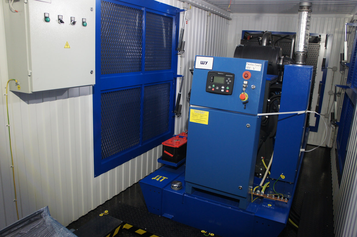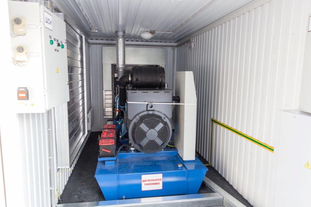 Дизельный генератор для резервирования внешней сети на случай перебоев с электроснабжением. Установлен в утепленный блок-контейнер СЕВЕР для защиты от суровых сибирских погодных условий.