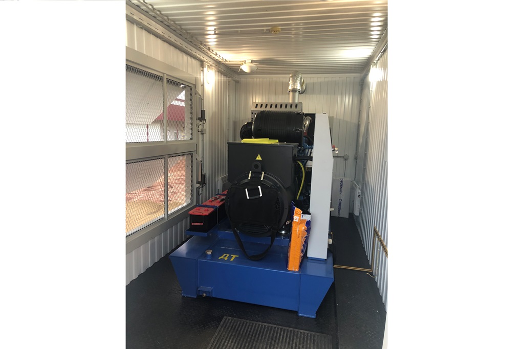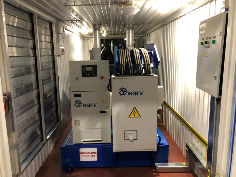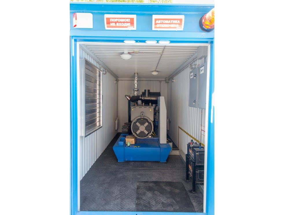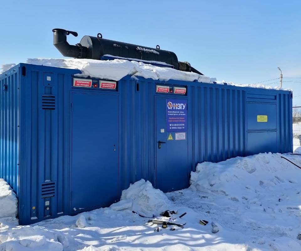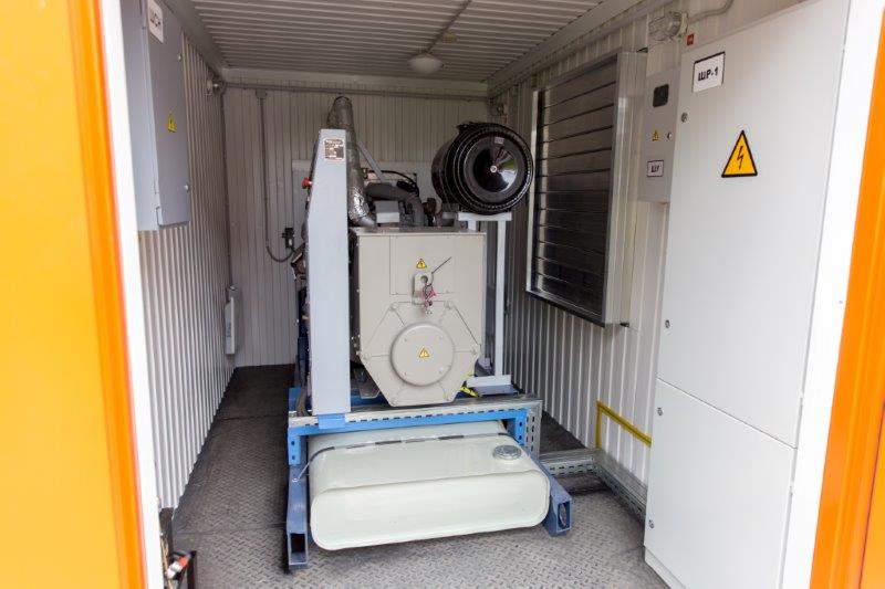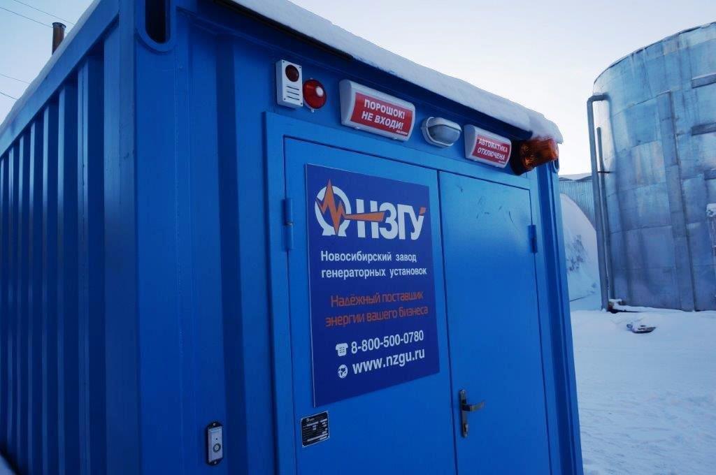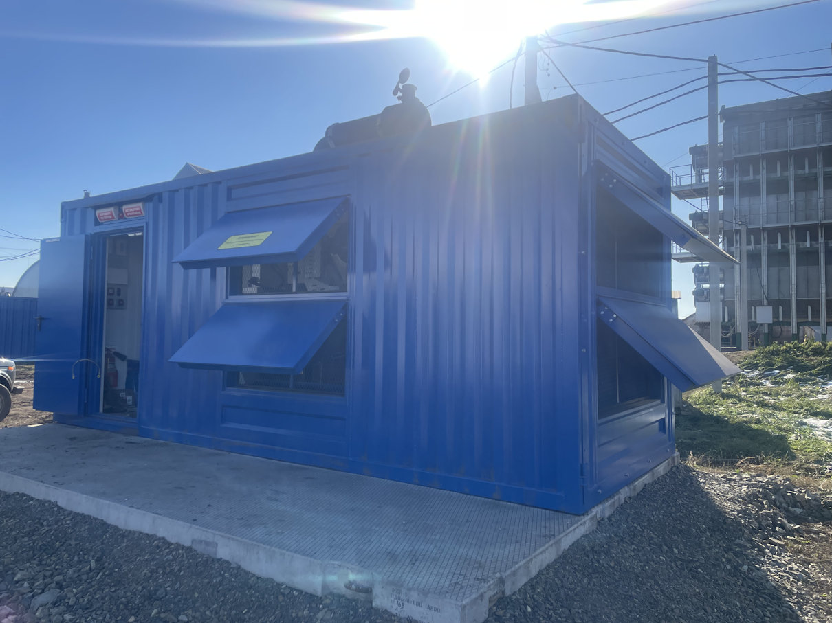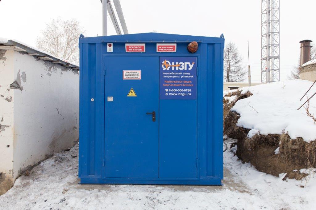 Дизельный генератор для резервирования внешней сети на случай перебоев с электроснабжением. Установлен в утепленный блок-контейнер СЕВЕР для защиты от суровых сибирских погодных условий.