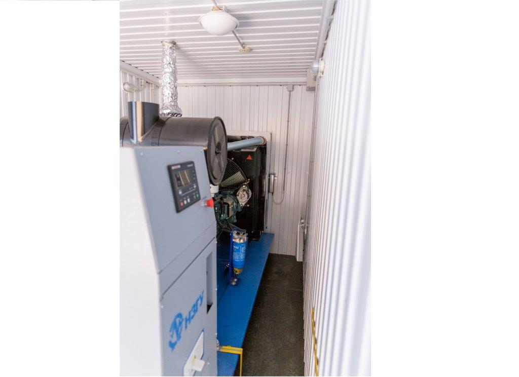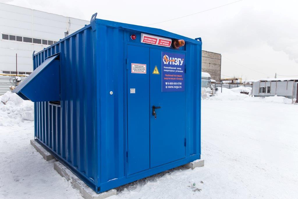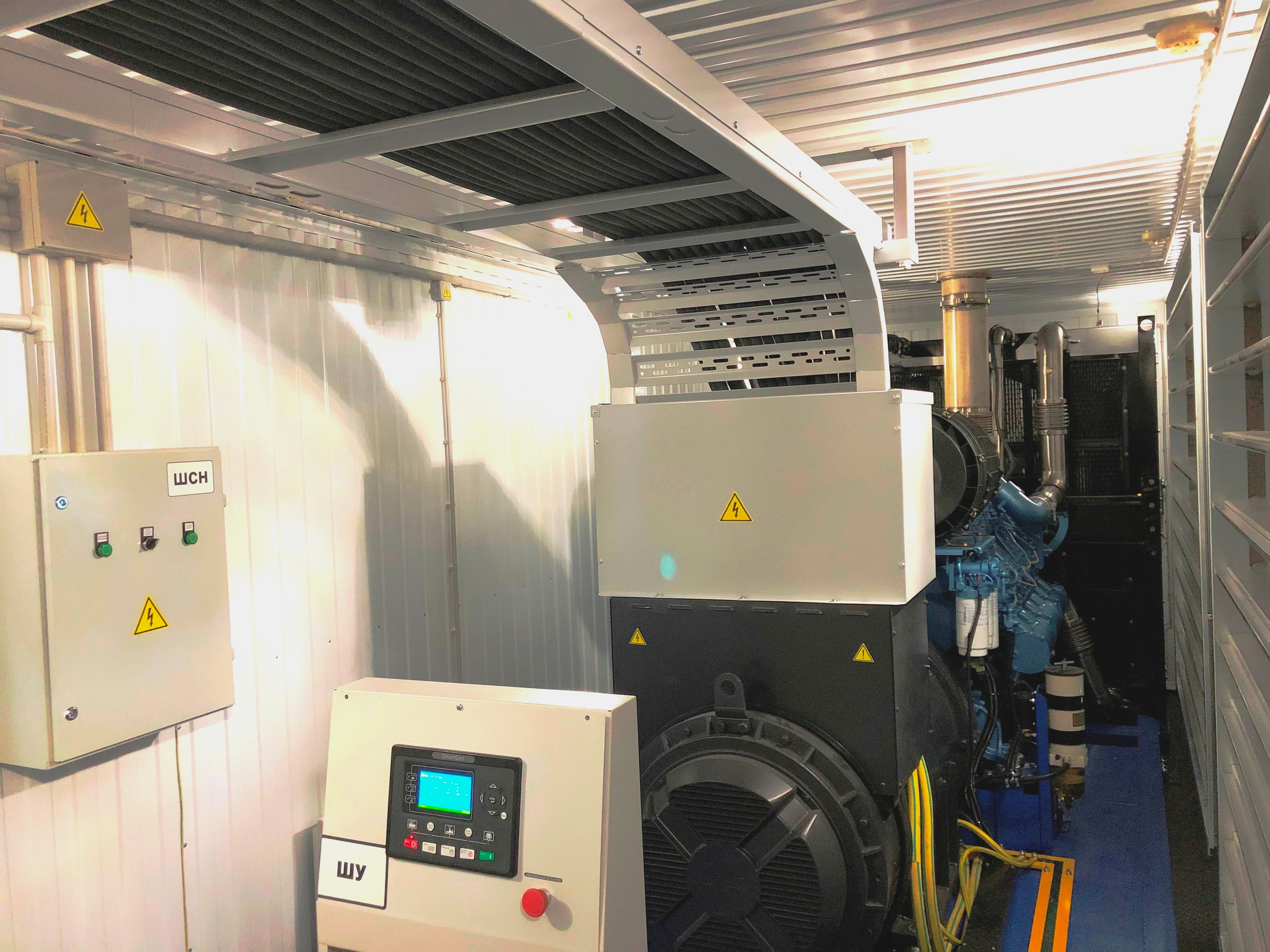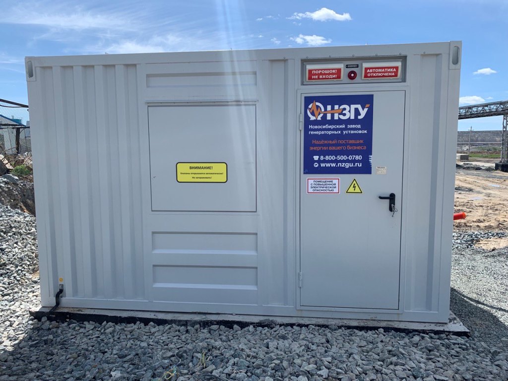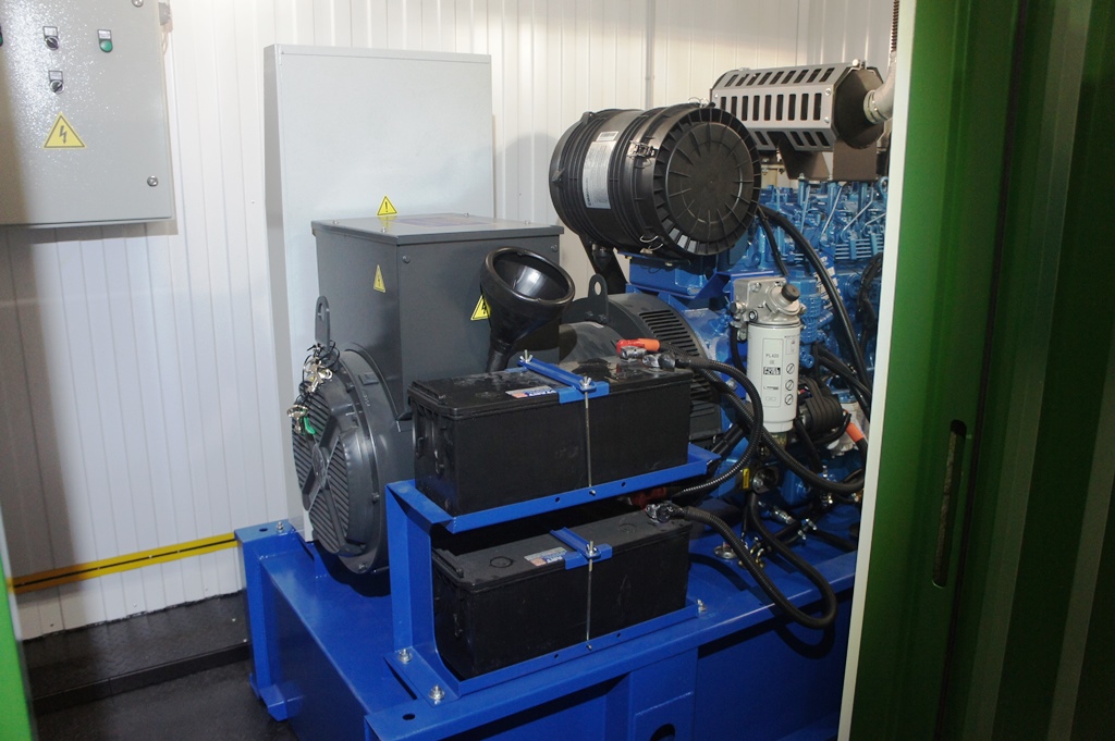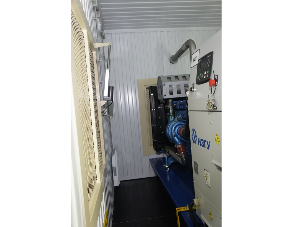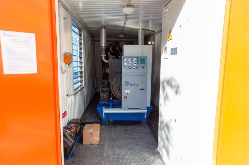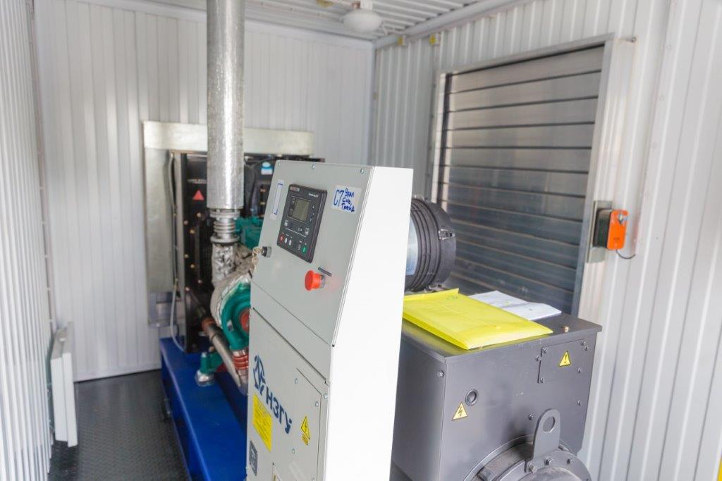 Дизельный генератор для резервирования внешней сети на случай перебоев с электроснабжением. Установлен в утепленный блок-контейнер СЕВЕР для защиты от суровых сибирских погодных условий.