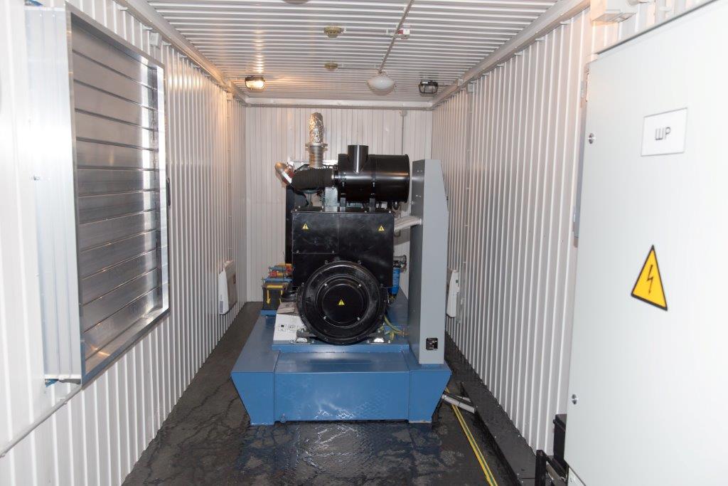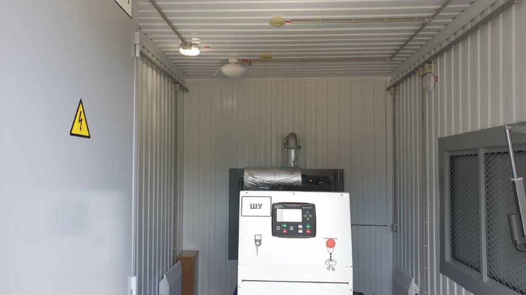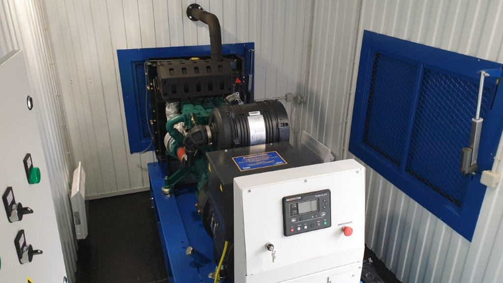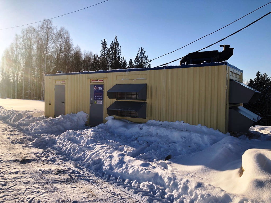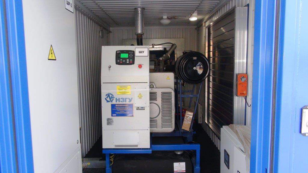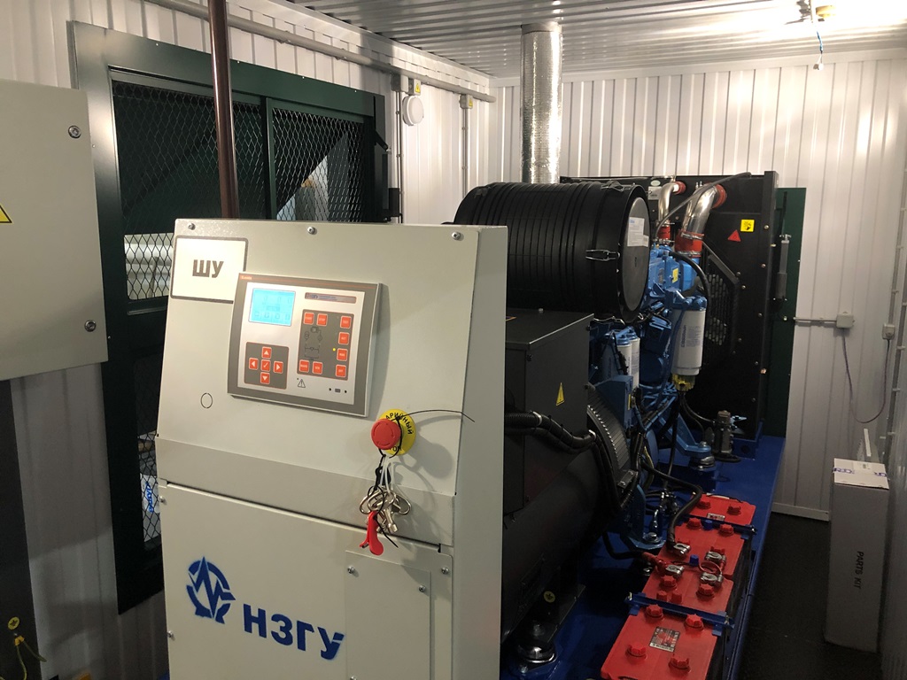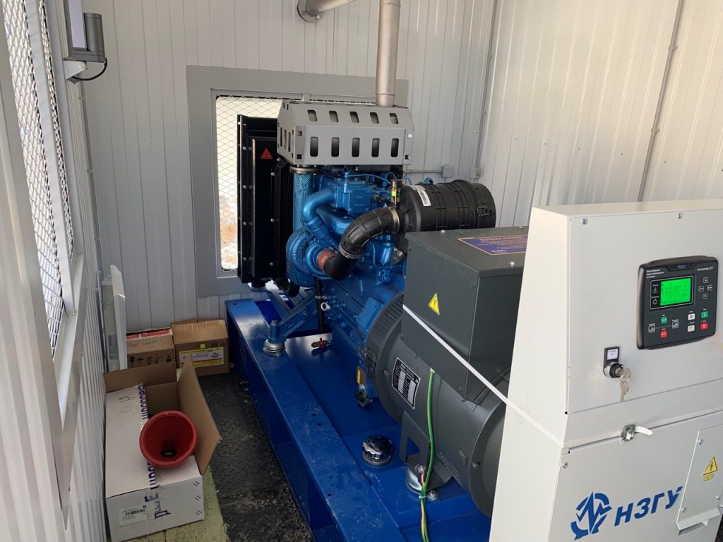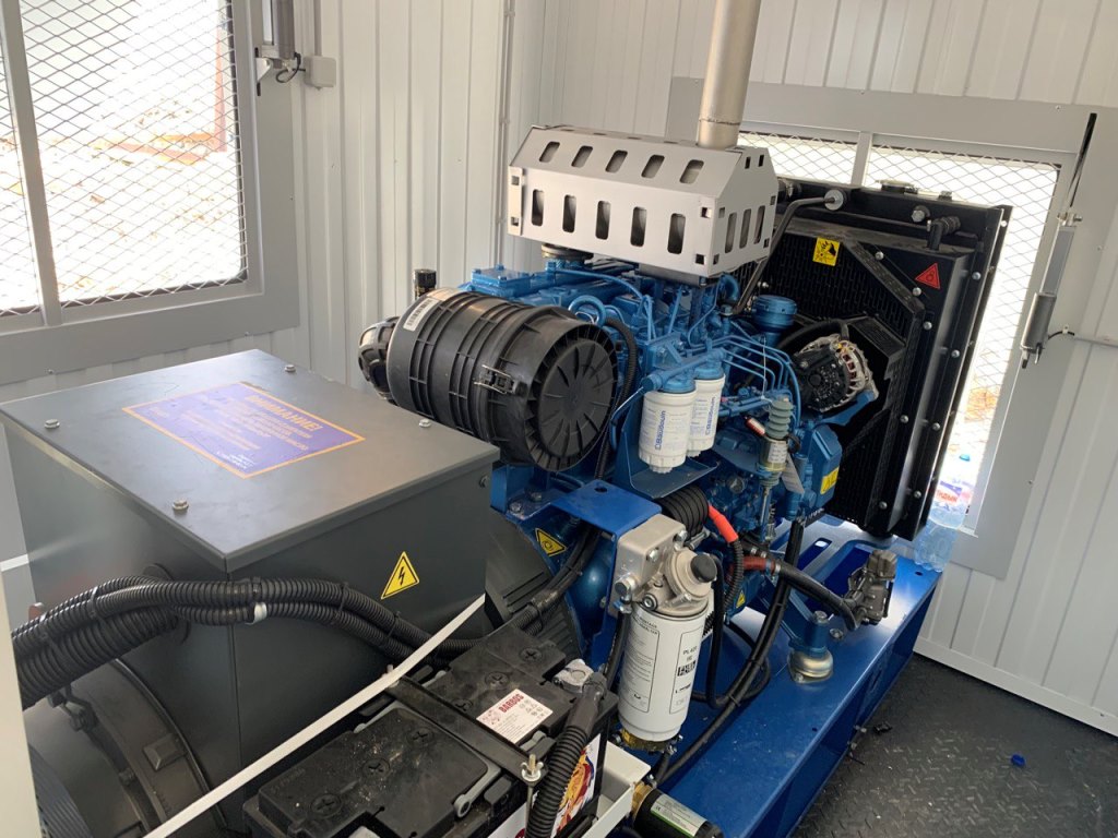 Дизельный генератор для резервирования внешней сети на случай перебоев с электроснабжением. Установлен в утепленный блок-контейнер СЕВЕР для защиты от суровых сибирских погодных условий.