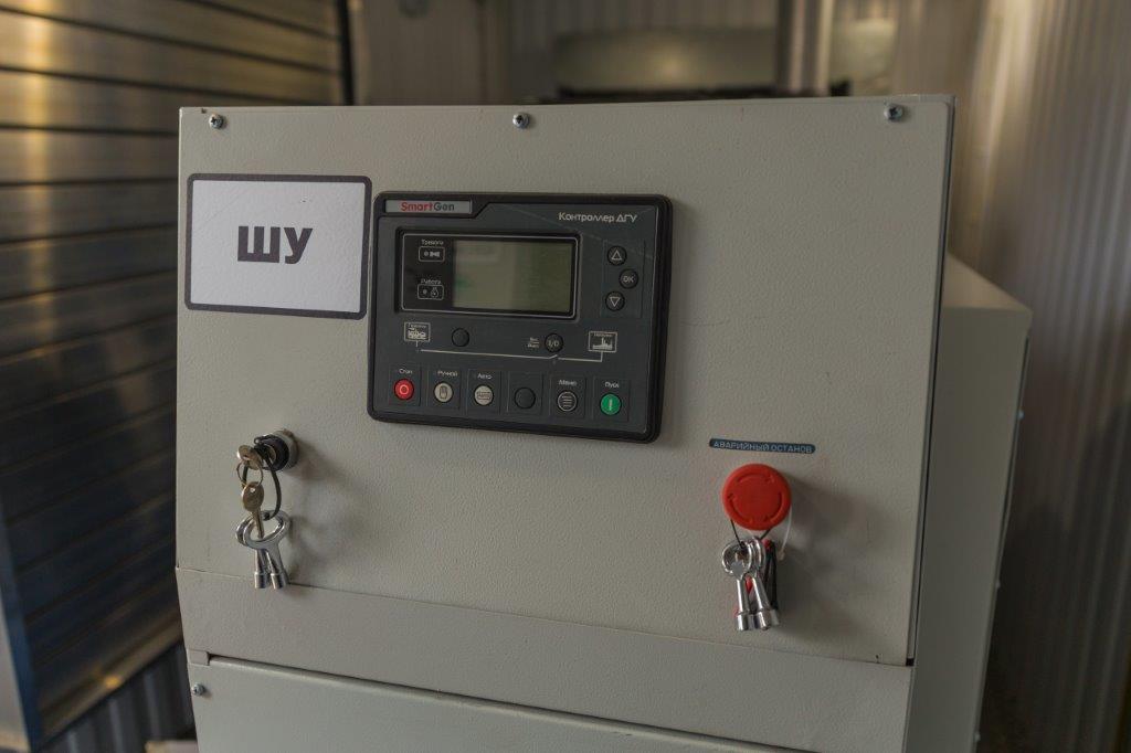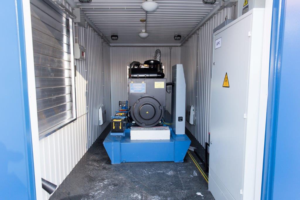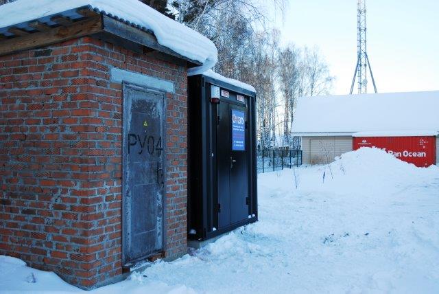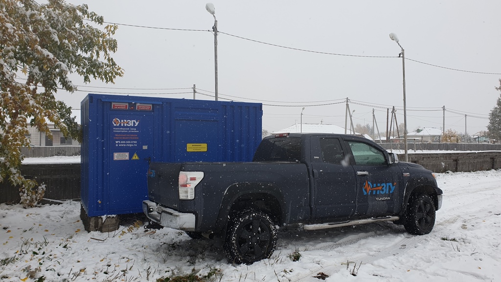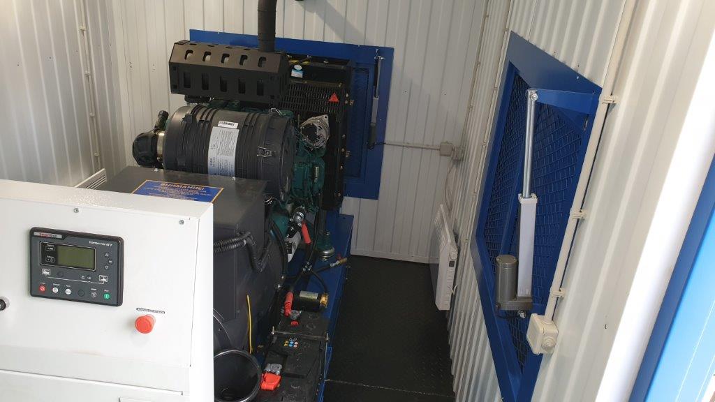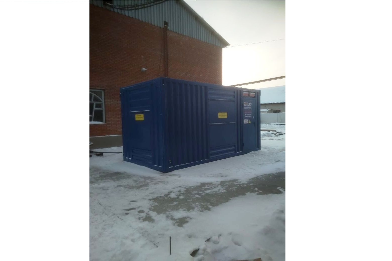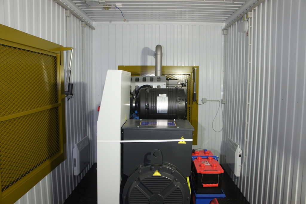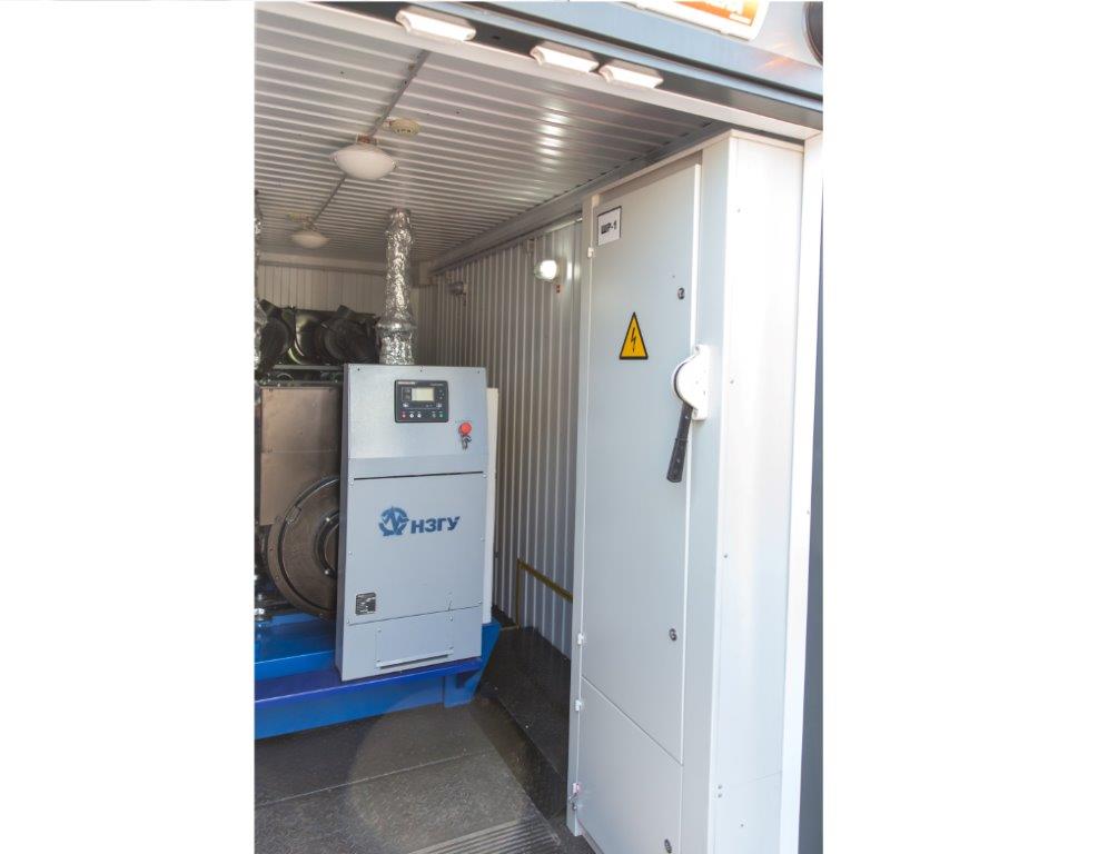 Дизельный генератор для резервирования внешней сети на случай перебоев с электроснабжением. Установлен в утепленный блок-контейнер СЕВЕР для защиты от суровых сибирских погодных условий.