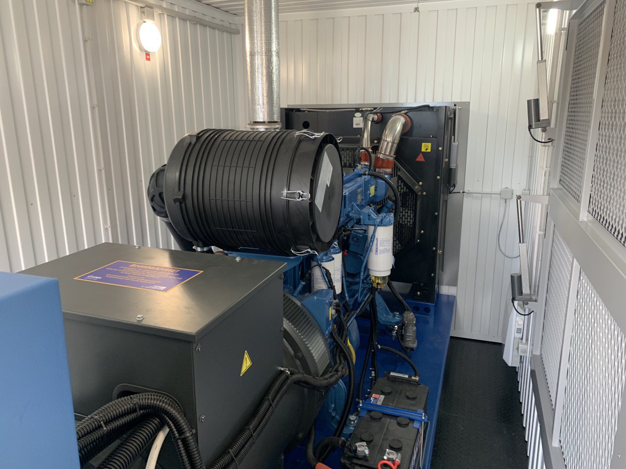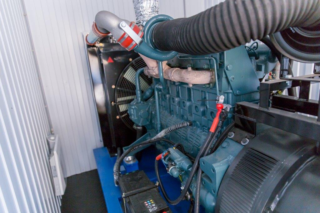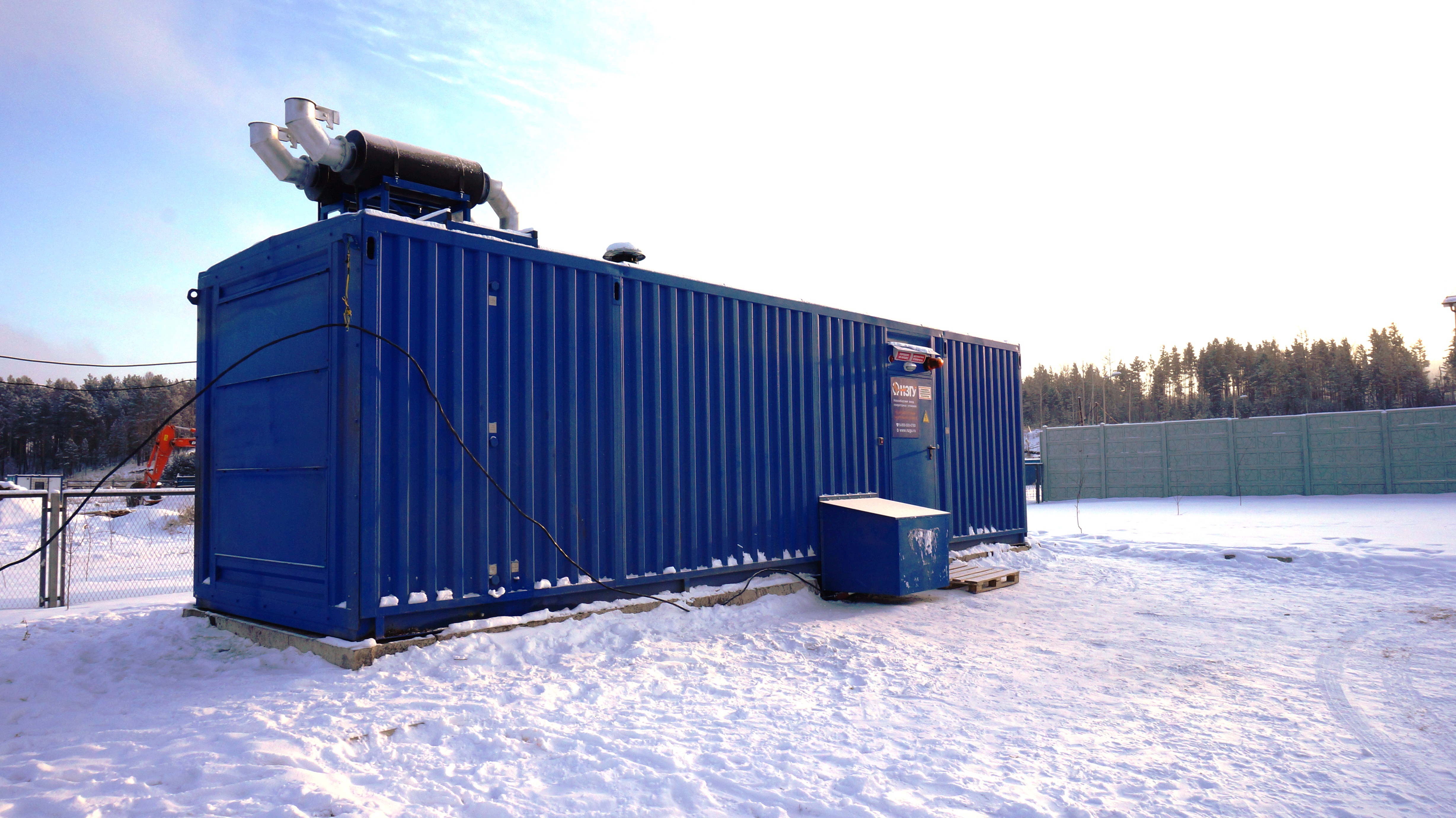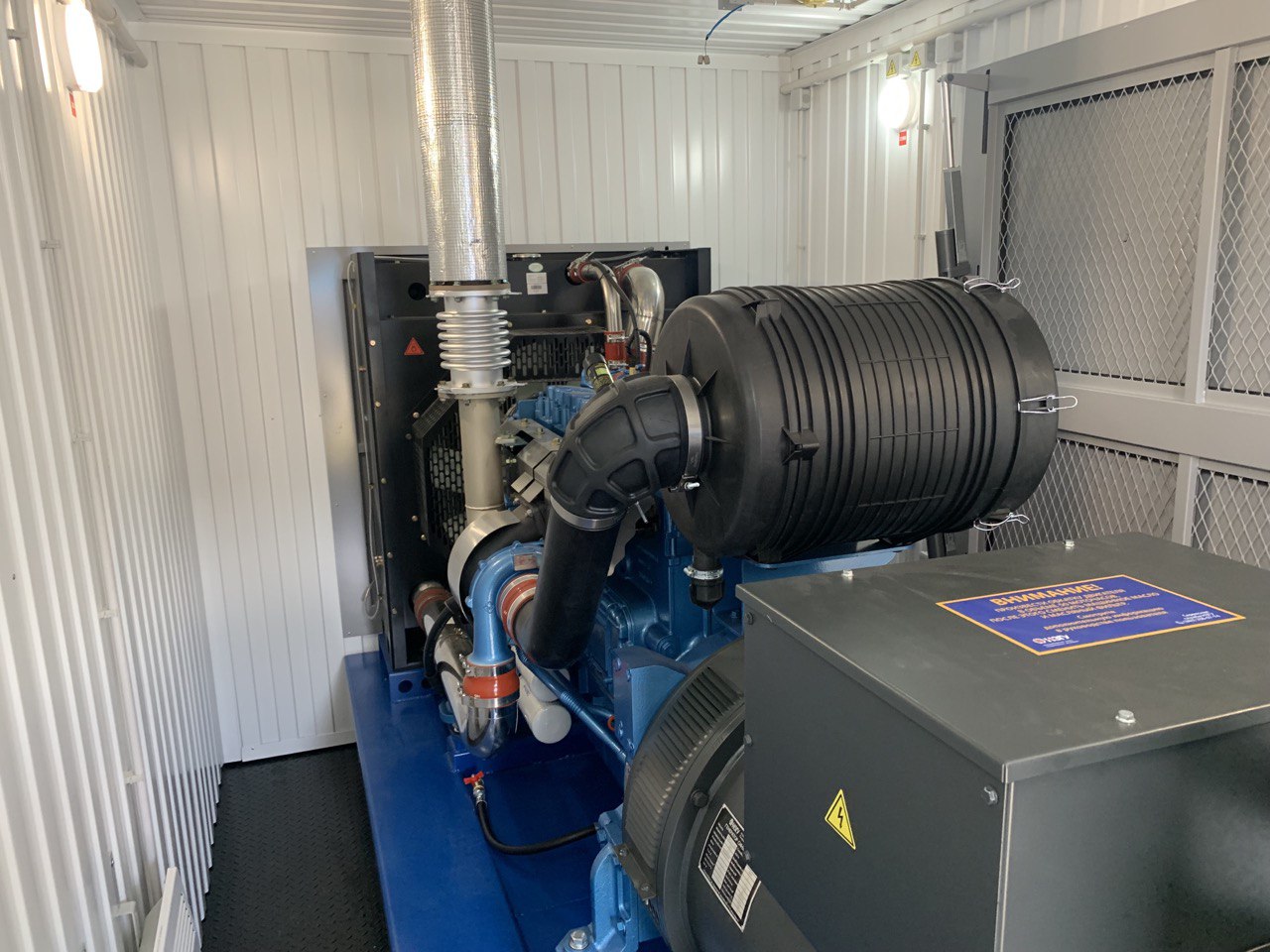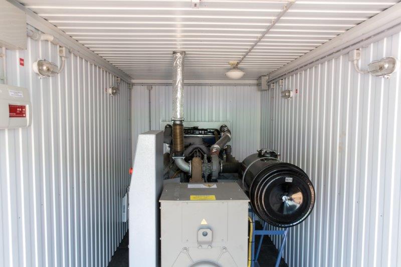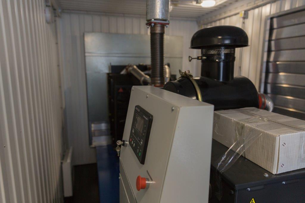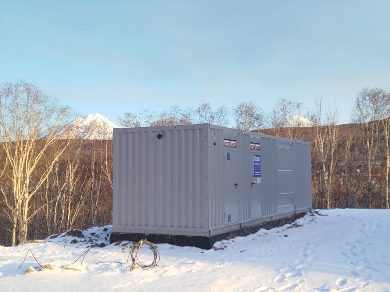 Дизельный генератор для резервирования внешней сети на случай перебоев с электроснабжением. Установлен в утепленный блок-контейнер СЕВЕР для защиты от суровых сибирских погодных условий.