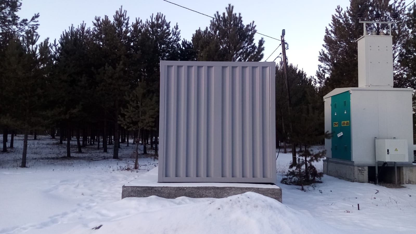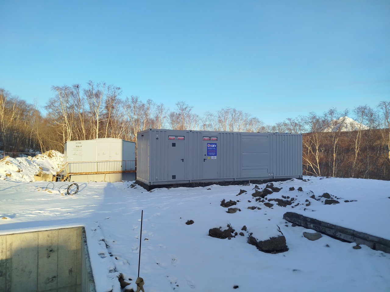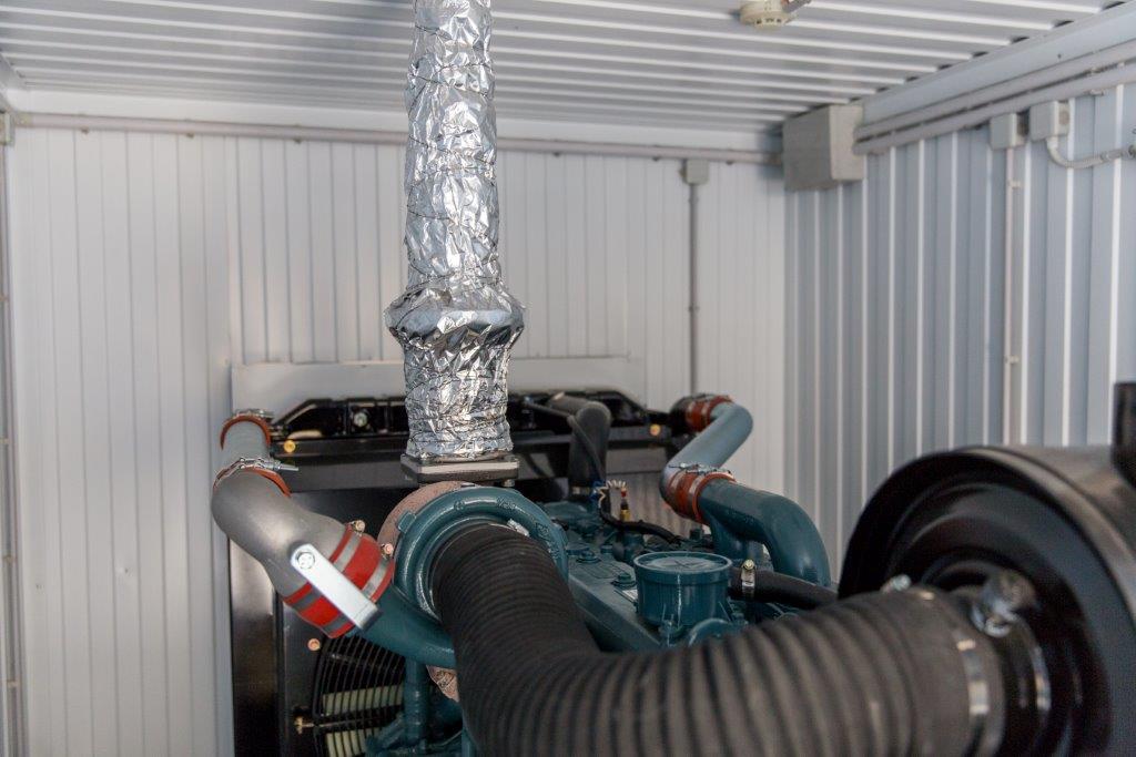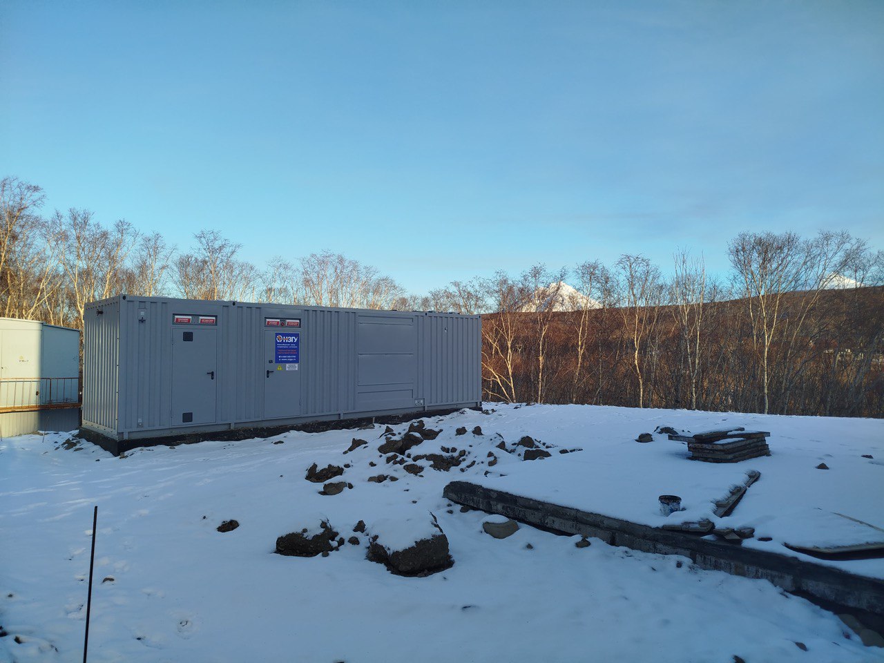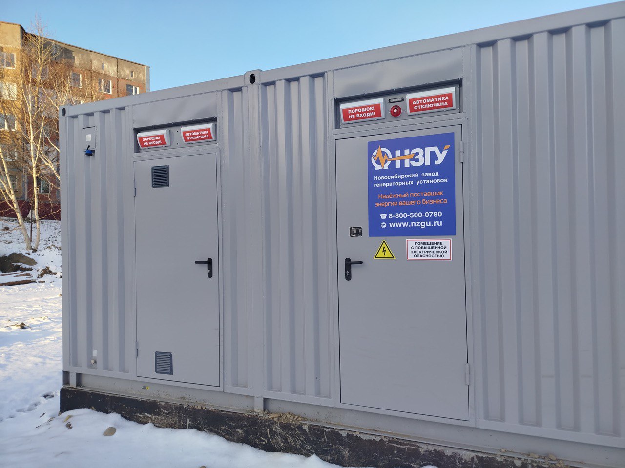 Дизельный генератор для резервирования внешней сети на случай перебоев с электроснабжением. Установлен в утепленный блок-контейнер СЕВЕР для защиты от суровых сибирских погодных условий.