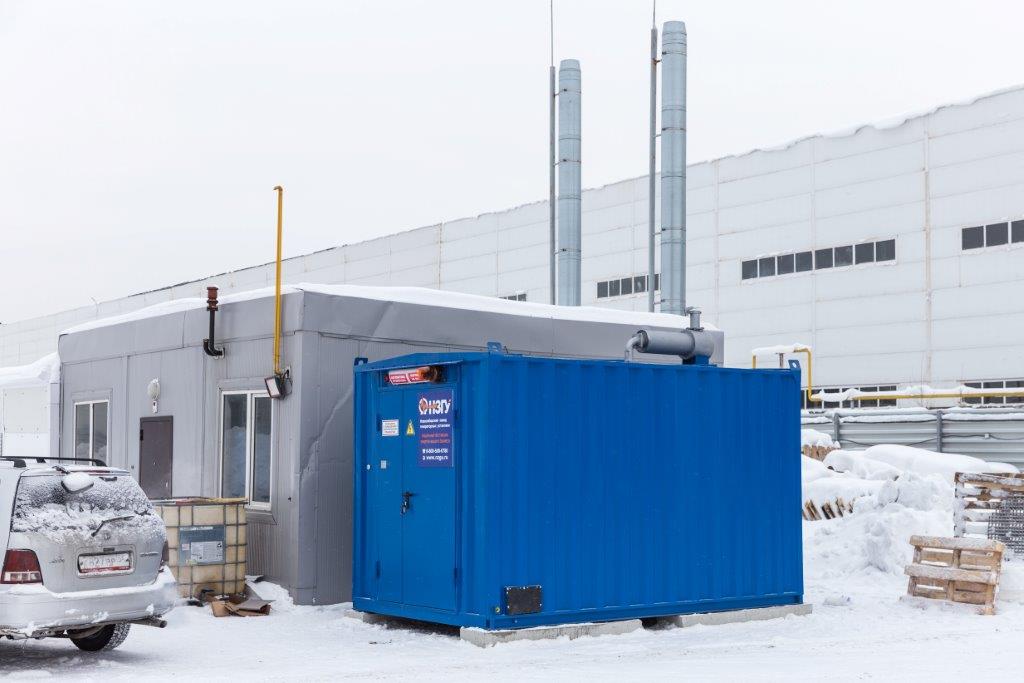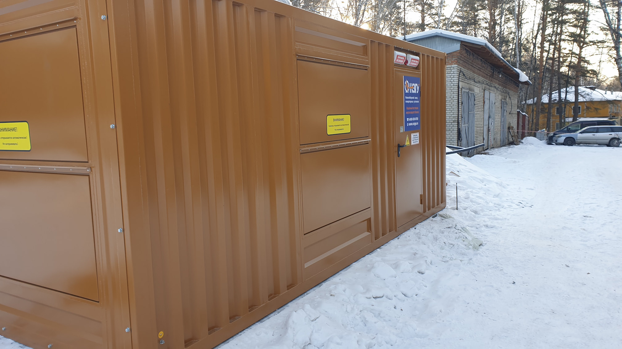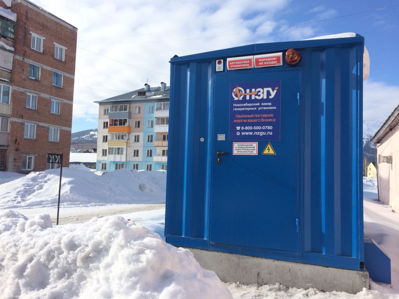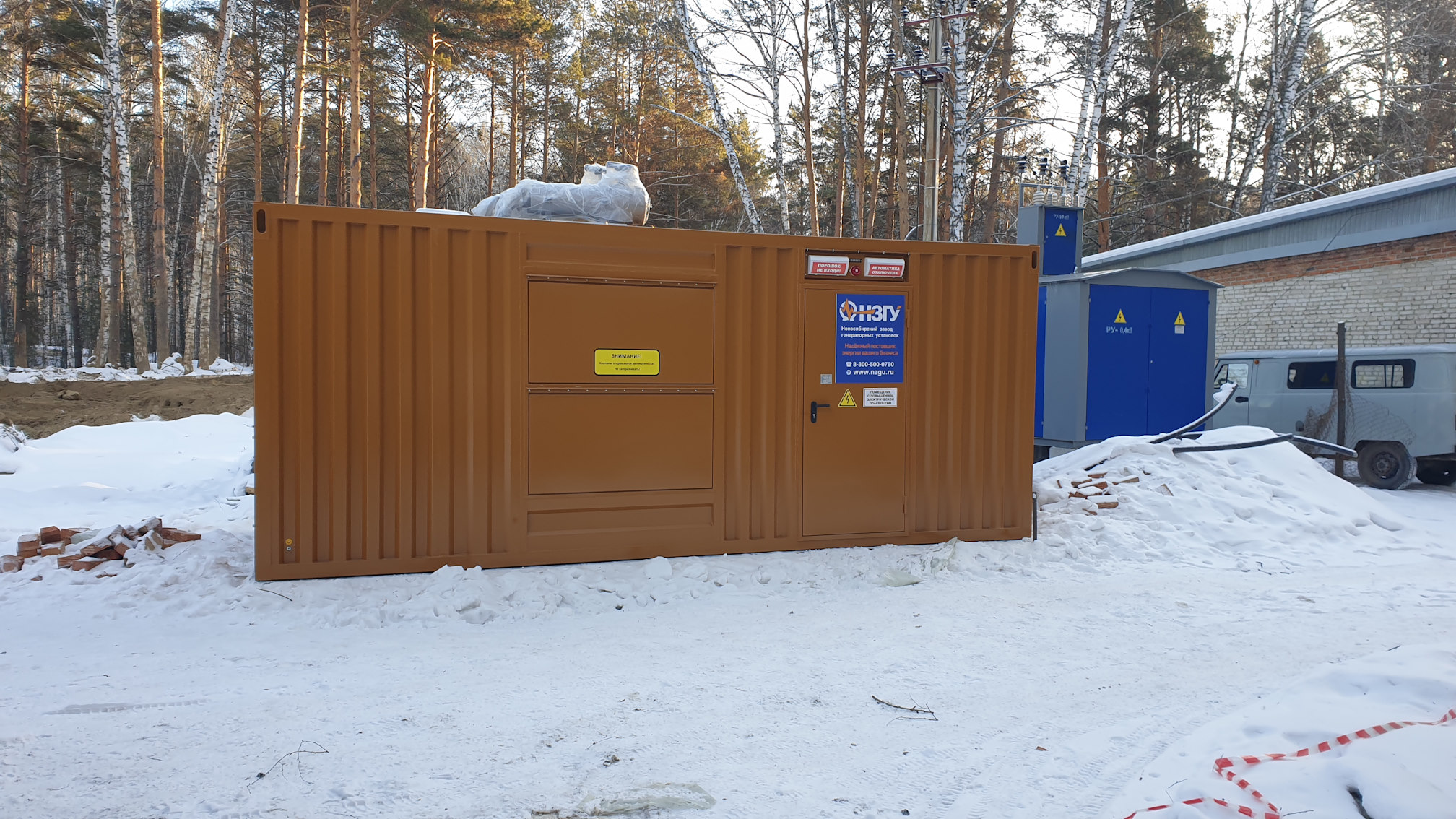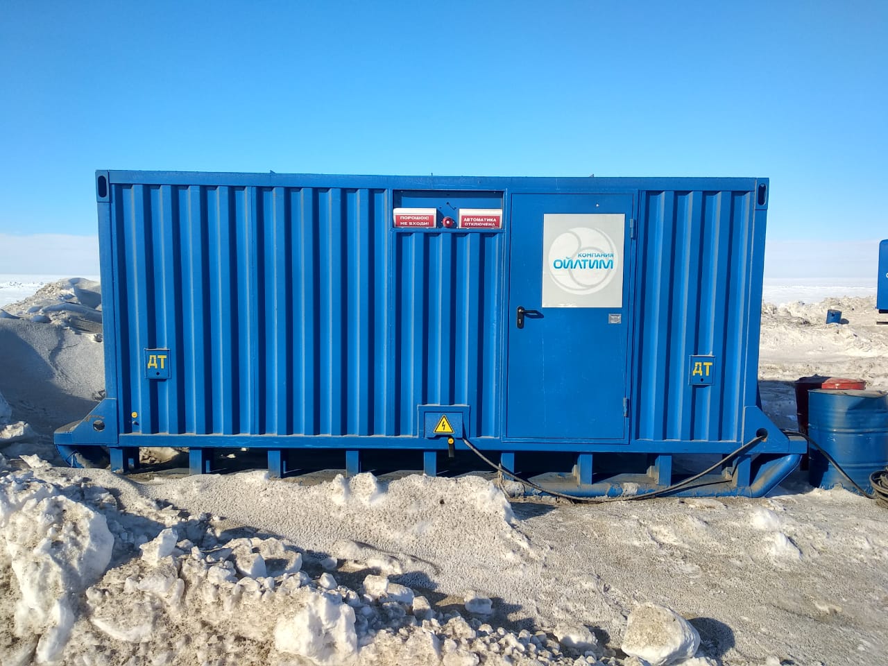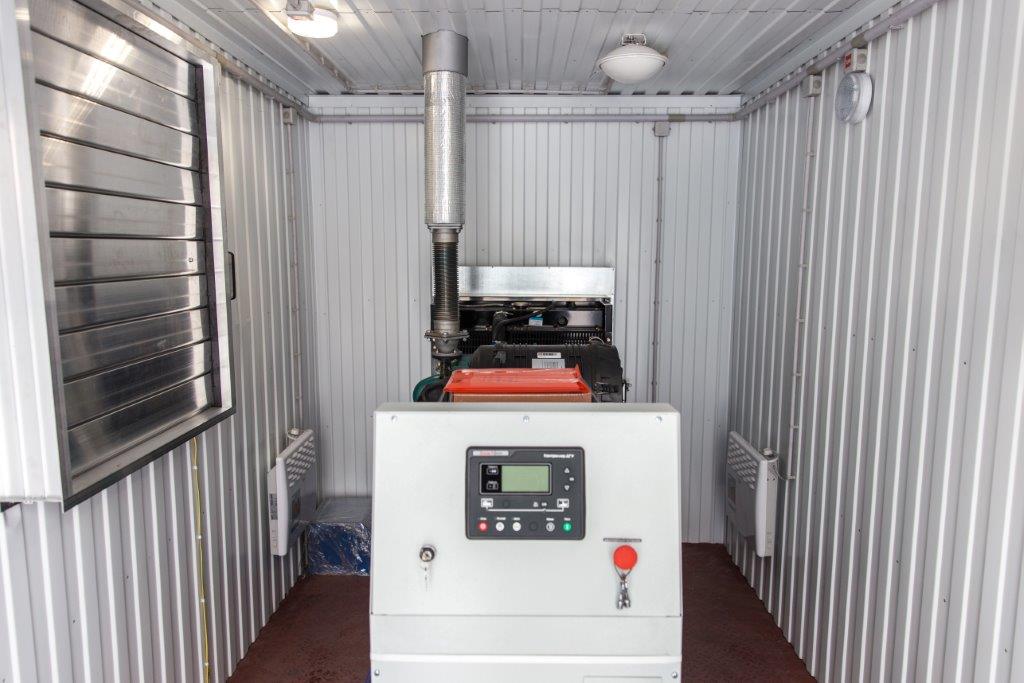 Дизельный генератор для резервирования внешней сети на случай перебоев с электроснабжением. Установлен в утепленный блок-контейнер СЕВЕР для защиты от суровых сибирских погодных условий.