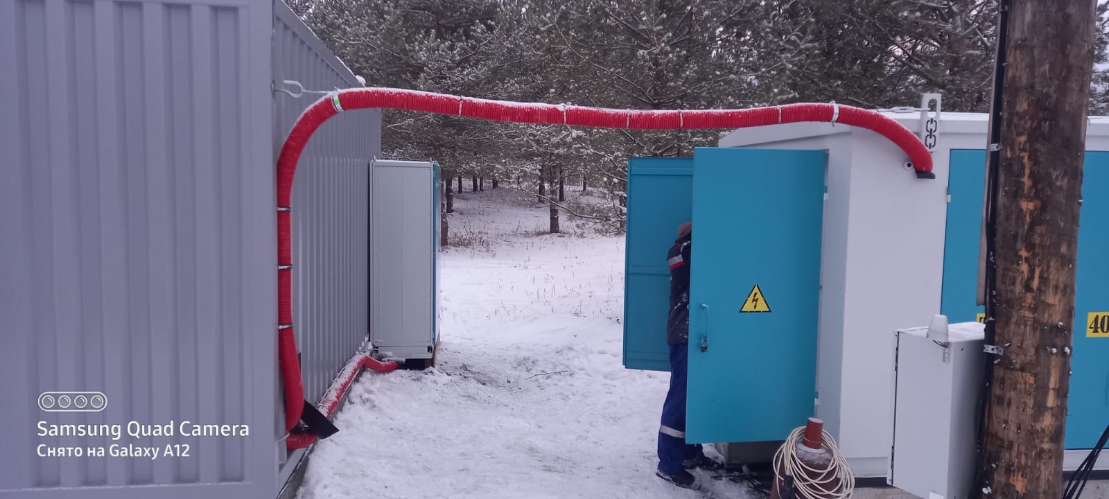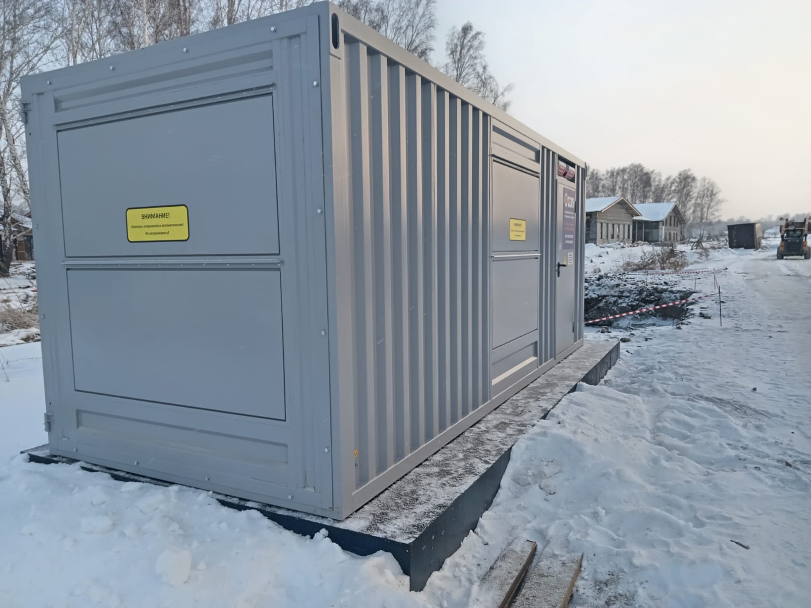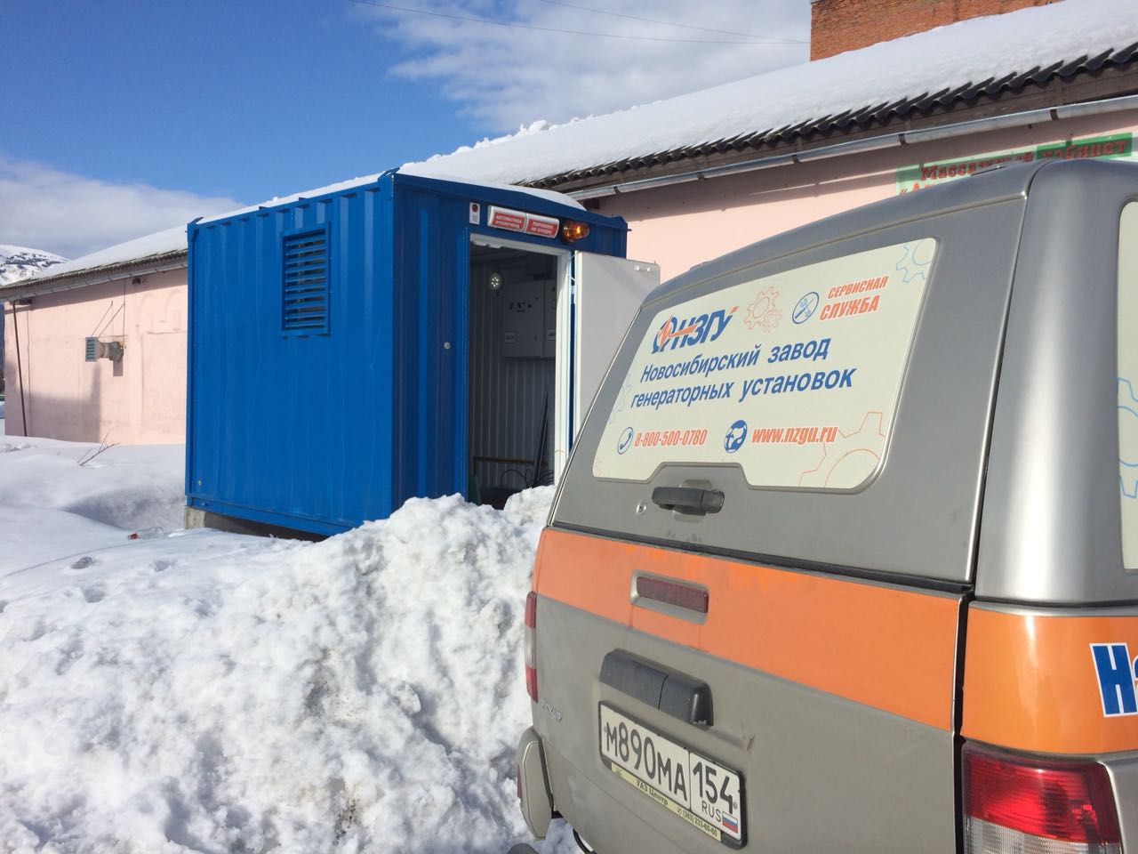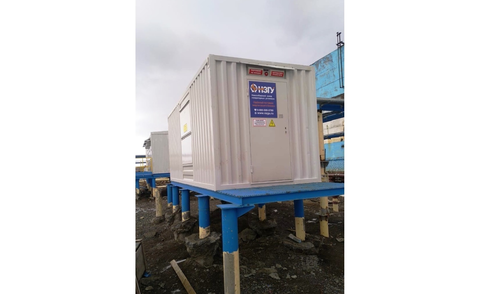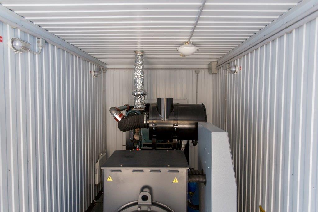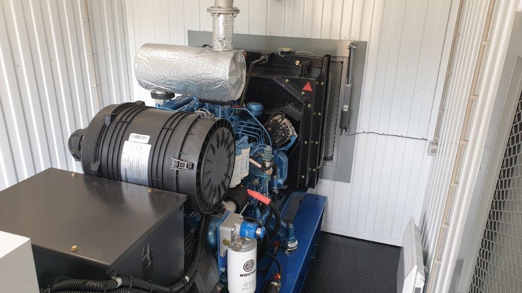 Дизельный генератор для резервирования внешней сети на случай перебоев с электроснабжением. Установлен в утепленный блок-контейнер СЕВЕР для защиты от суровых сибирских погодных условий.