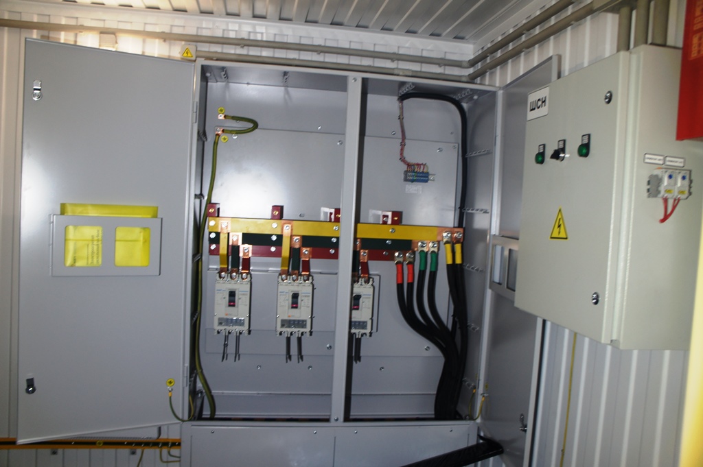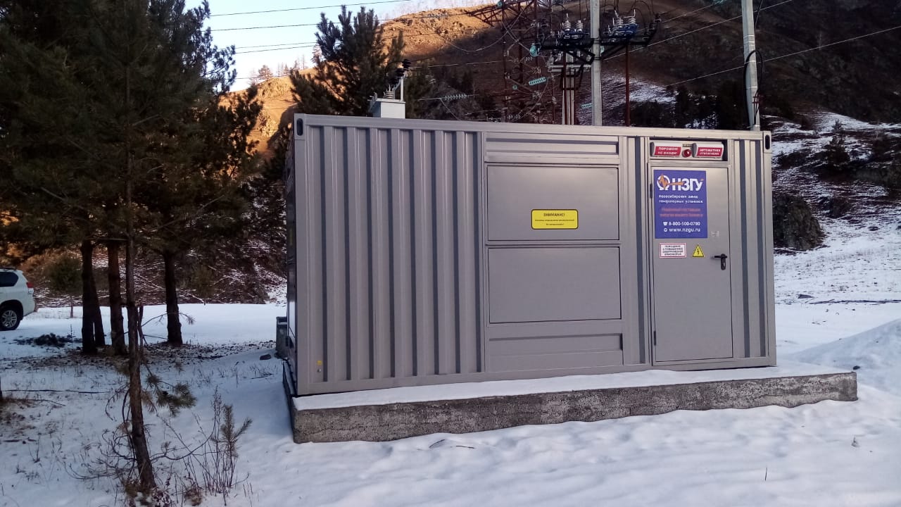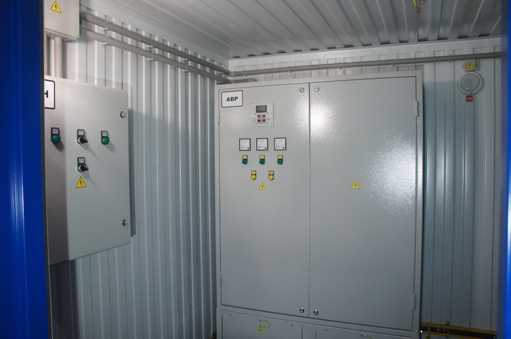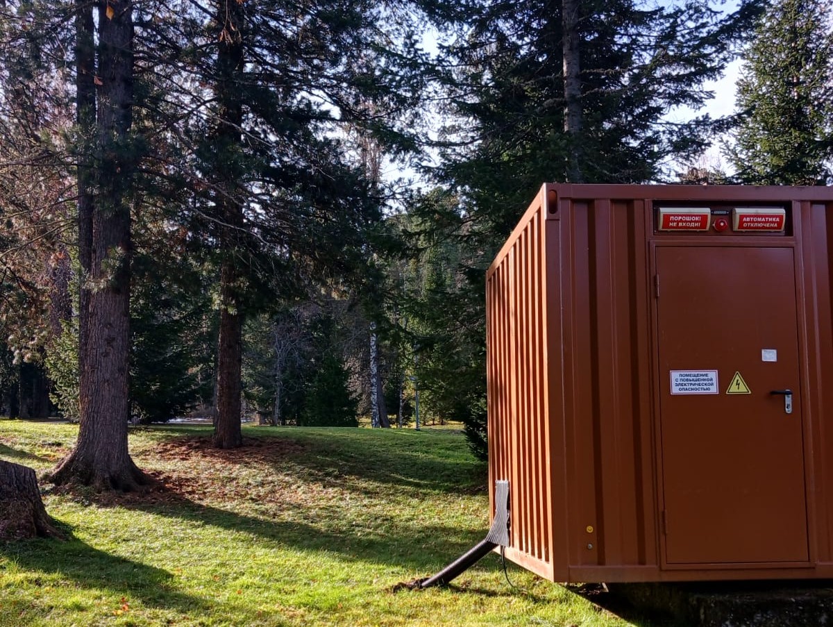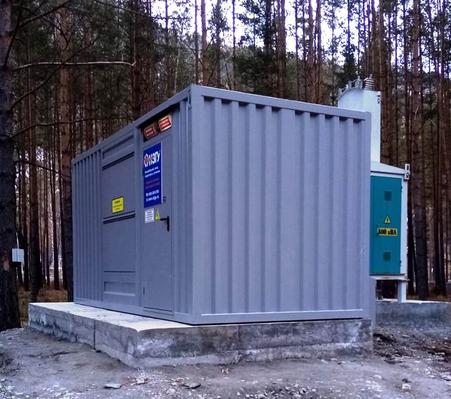 Блок-контейнер с трансформаторной подстанцией 250 кВА 10/0,4 кВ и дизельгенератором 125 кВА для гарантированного электроснабжения базы отдыха в Горном Алтае. В основном режиме питание осуществляется от ТП 10/0,4кВ, при пропадании внешней сети - от дизельгенератора 100 кВт. Переключение осуществляется в автоматическом режиме шкафом АВР.