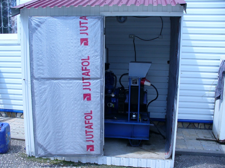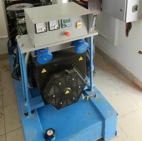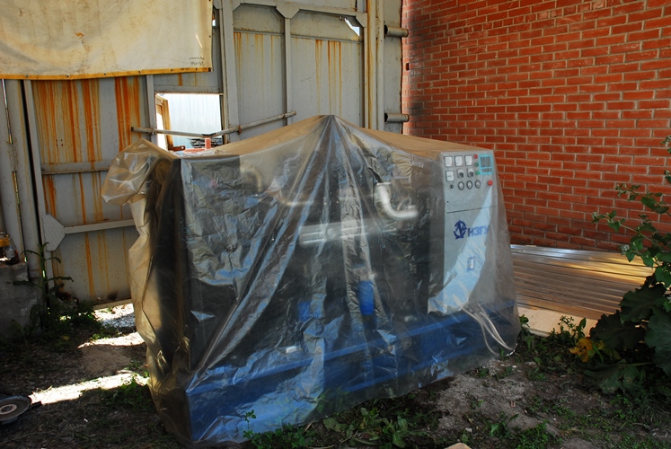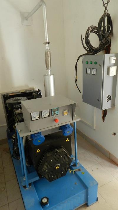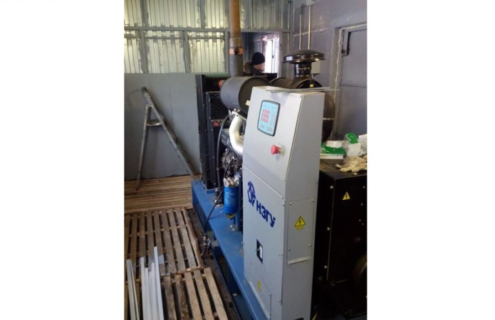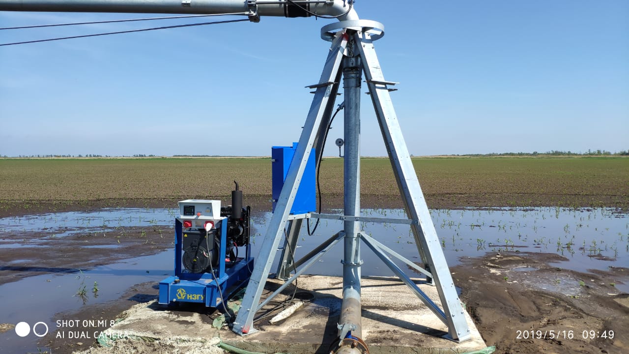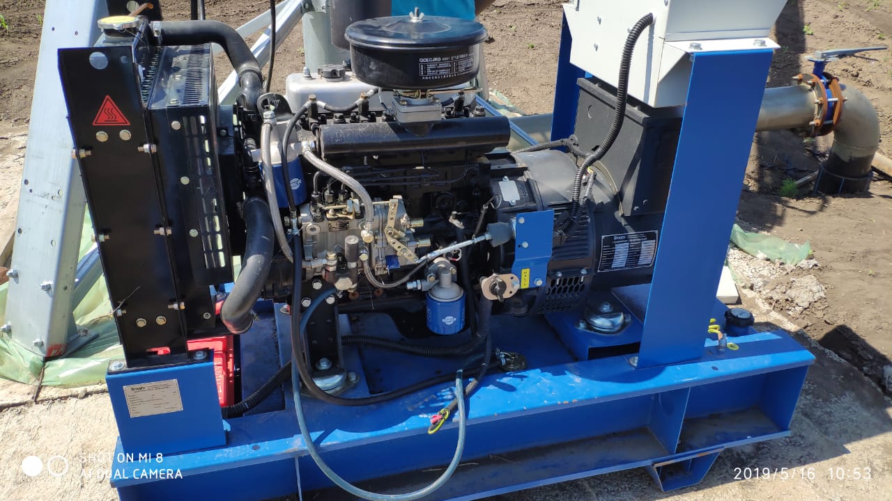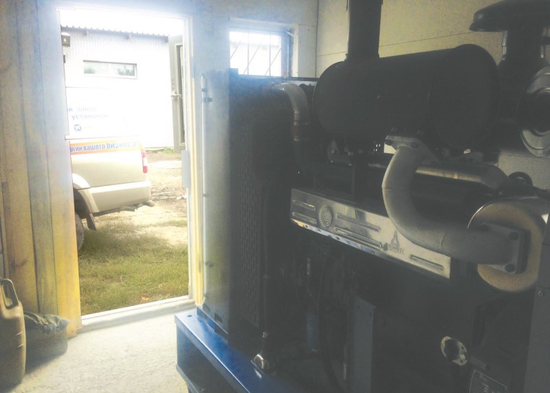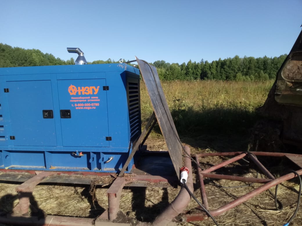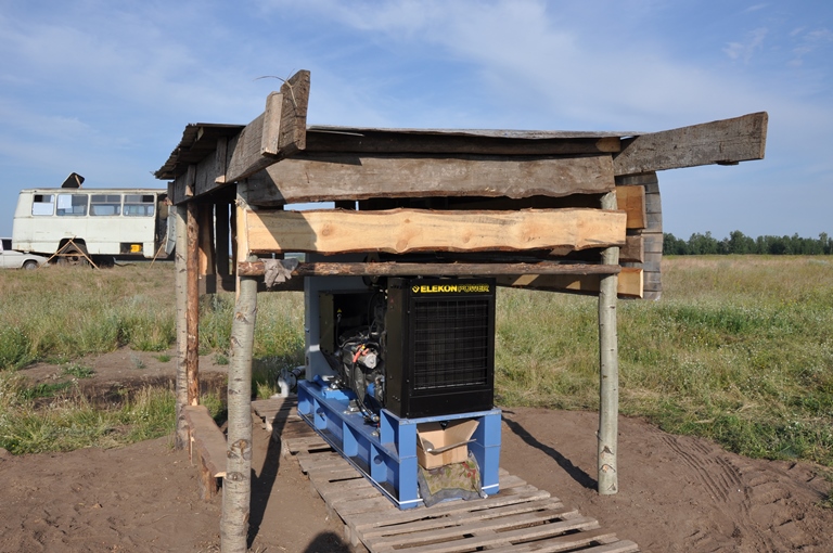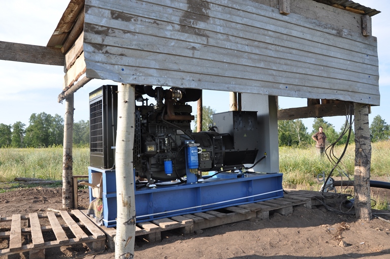 Дизельный генератор используется для питания погружного насоса артезианской скважины недалеко от города Бийск, Алтайского края. Дизельгенератор был приобретен заказчиком в самый разгар засушливого лета для спасения посевов от засухи. Как видно на фотографиях из-за нехватки времени агрегат был запущен в работу, что называется "с колёс". Для защиты от атмосферных осадков было обустроено временное сооружение из подручных материалов.