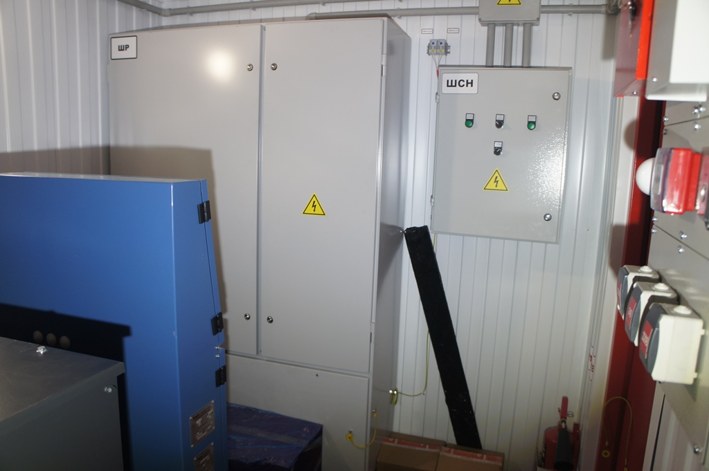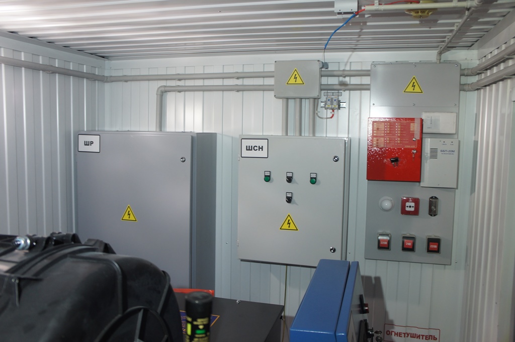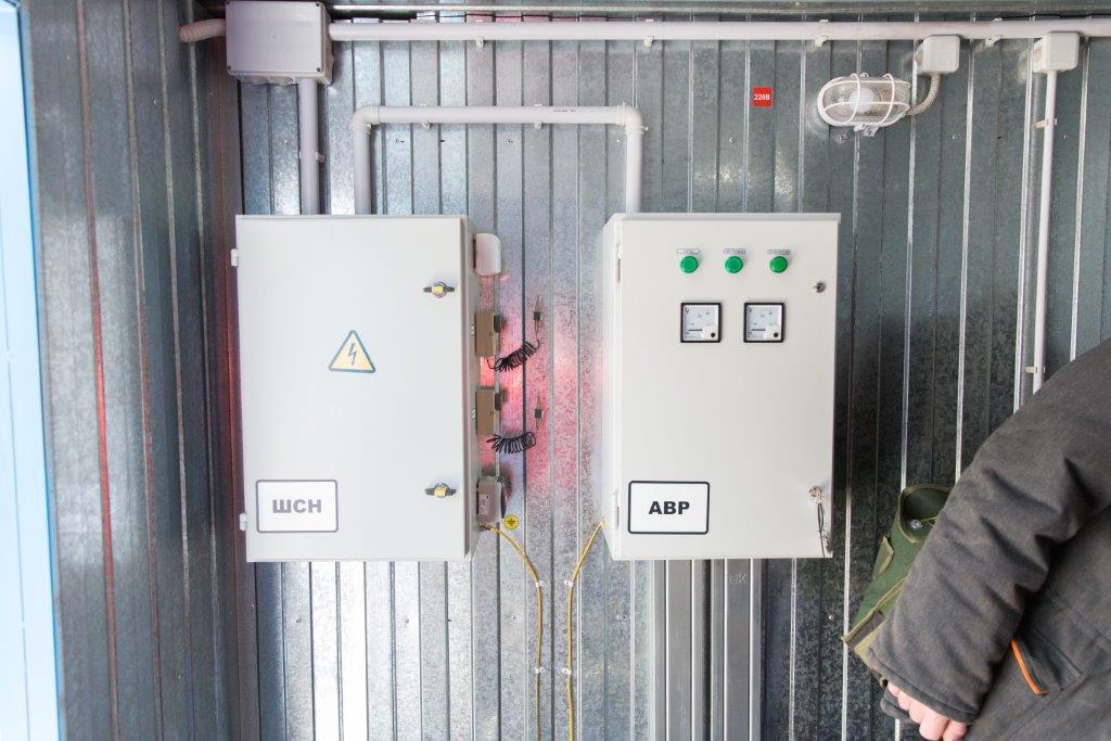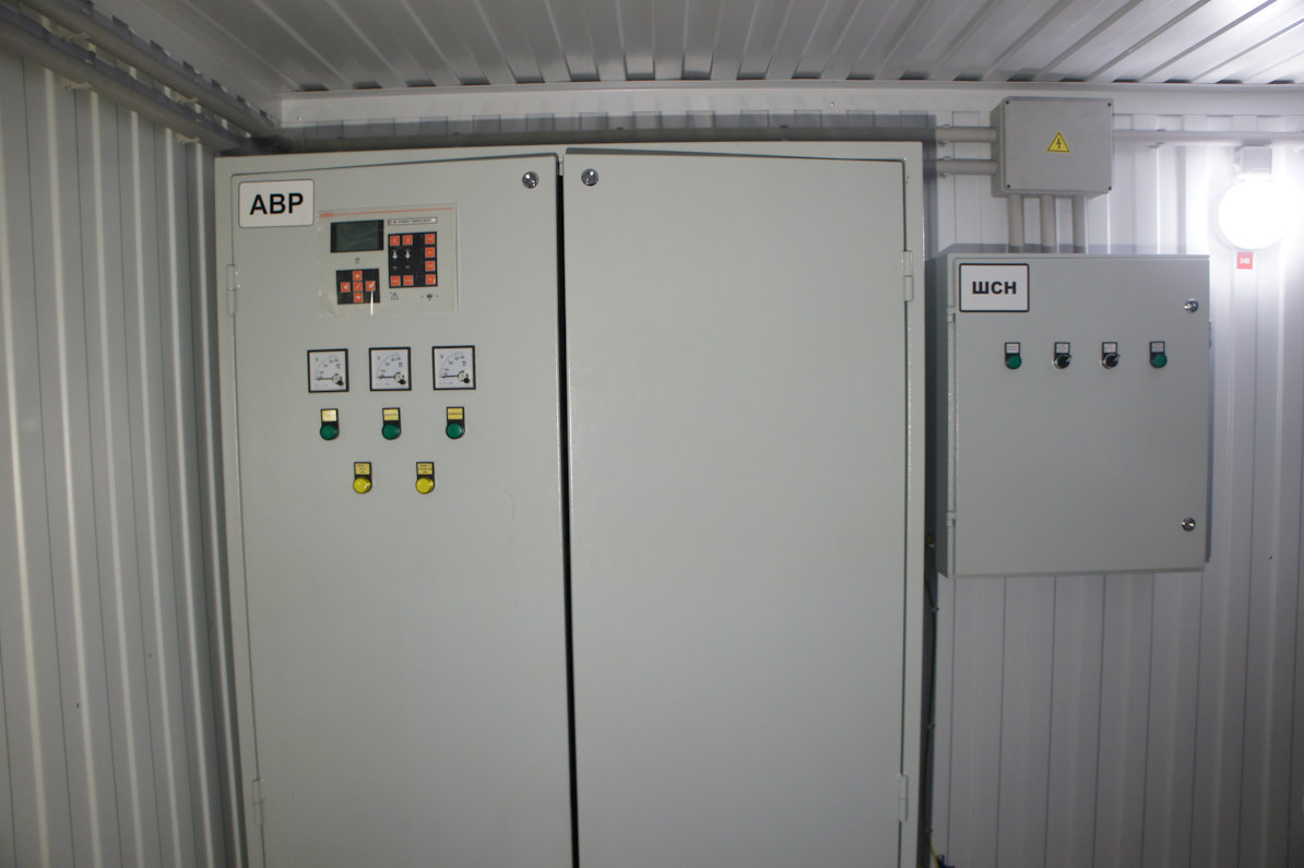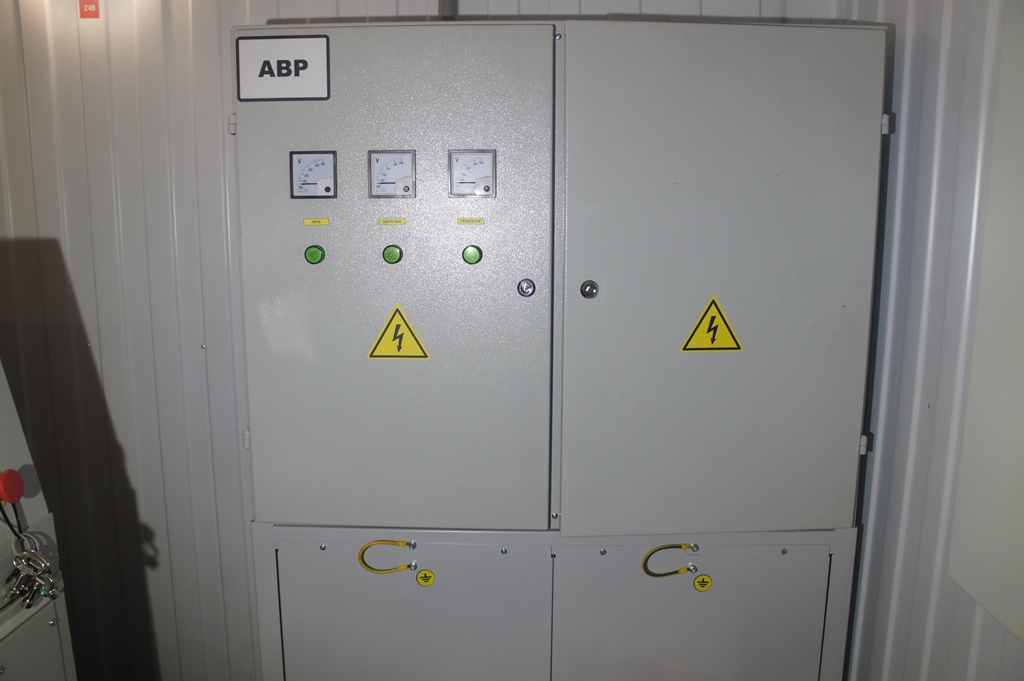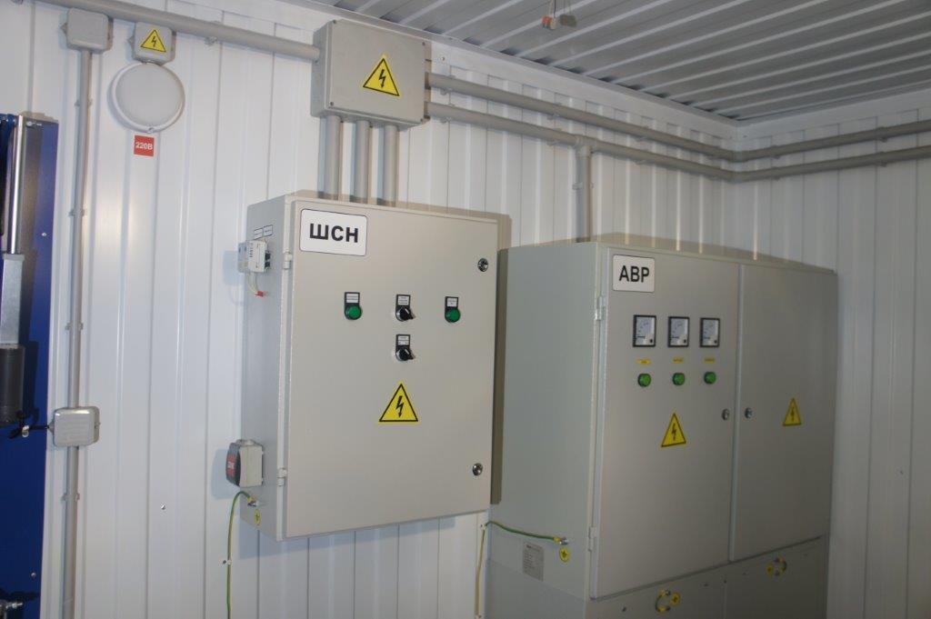 Система резервного электроснабжения объекта - Кудряшовский мясокомбинат. Была поставлена задача по резервированию с помощью дизельгенератора электропитания котельной и другого оборудования мясокомбината при пропадании сети на обоих силовых вводах ТП. Задача была решена сотрудниками нашего предприятия. Для контроля состояния системы в блок-контейнере установлен GSM передатчик.