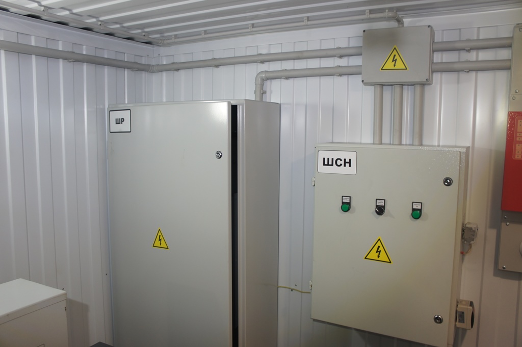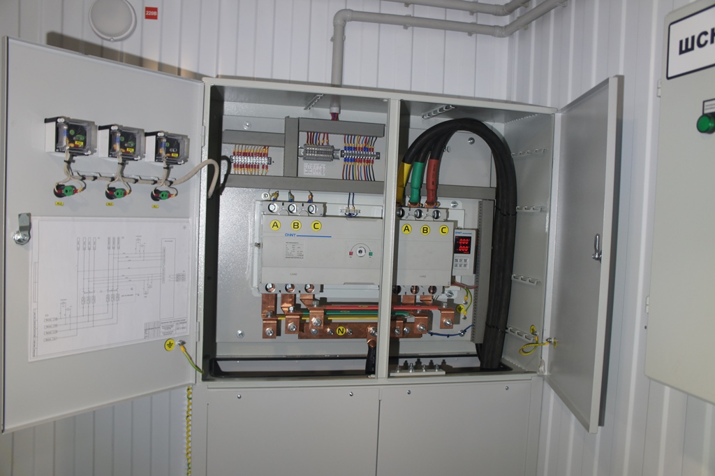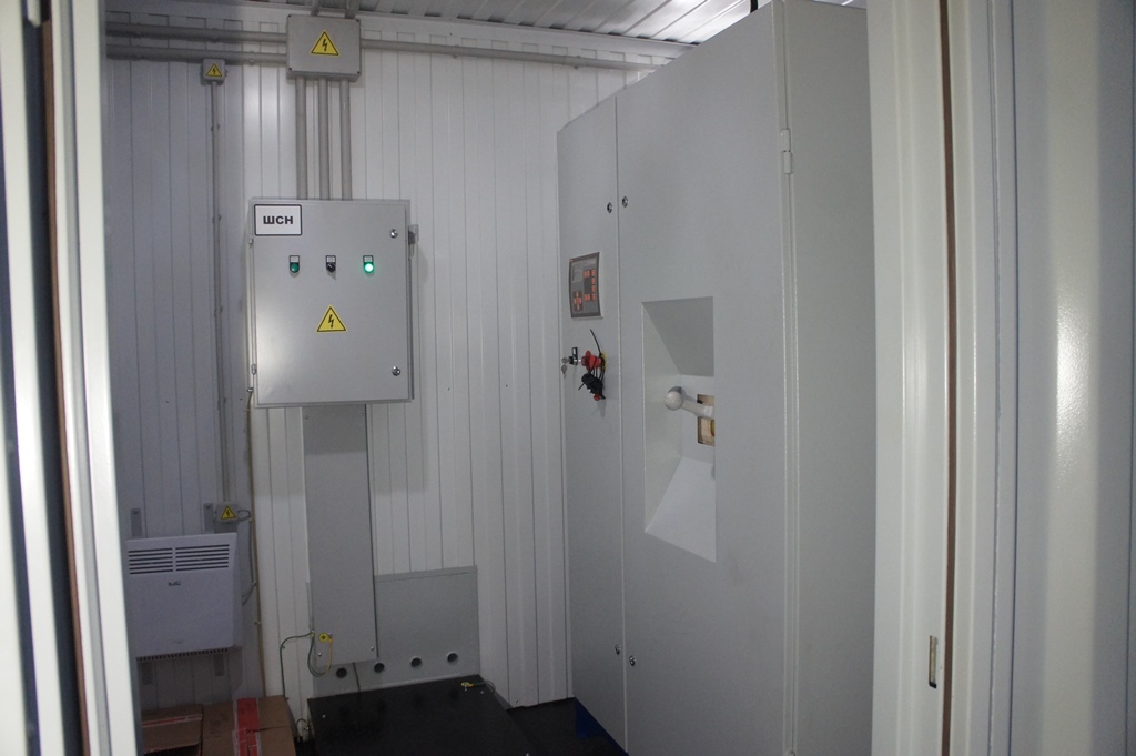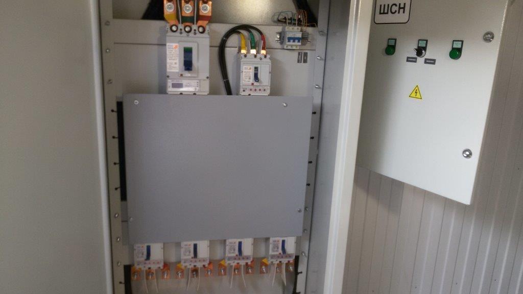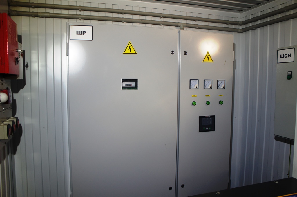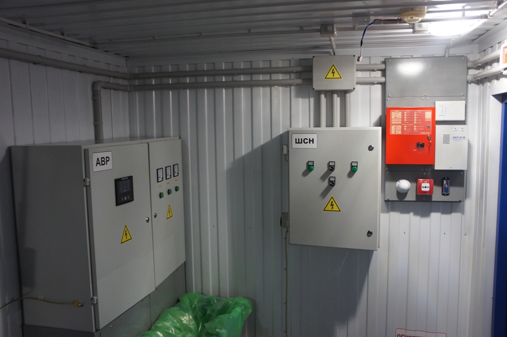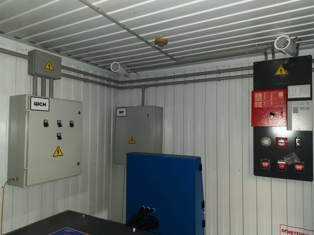 Система резервного электроснабжения объекта - Кудряшовский мясокомбинат. Была поставлена задача по резервированию с помощью дизельгенератора электропитания котельной и другого оборудования мясокомбината при пропадании сети на обоих силовых вводах ТП. Задача была решена сотрудниками нашего предприятия. Для контроля состояния системы в блок-контейнере установлен GSM передатчик.
