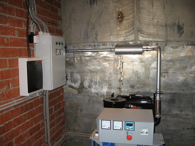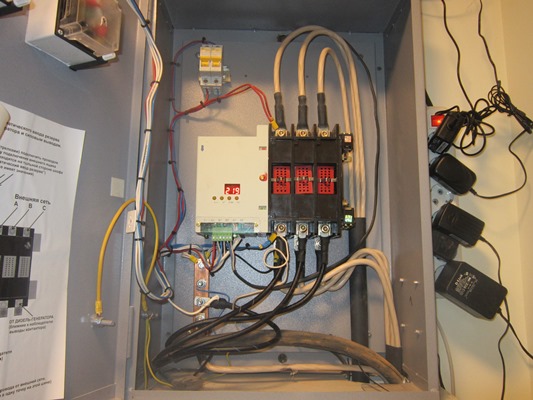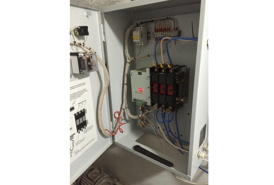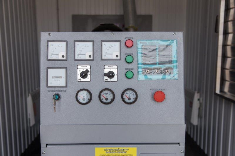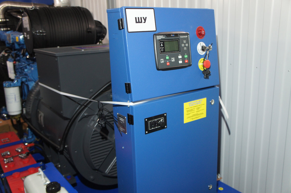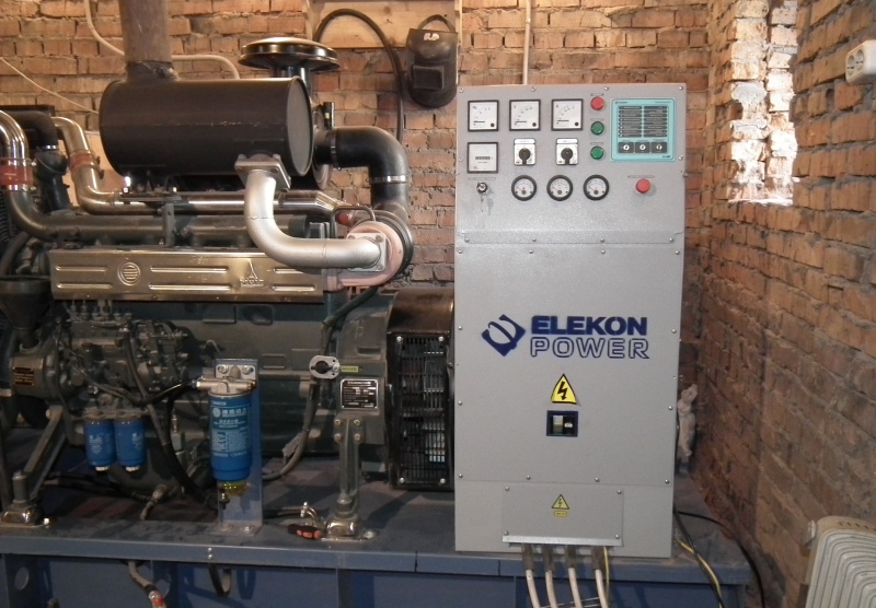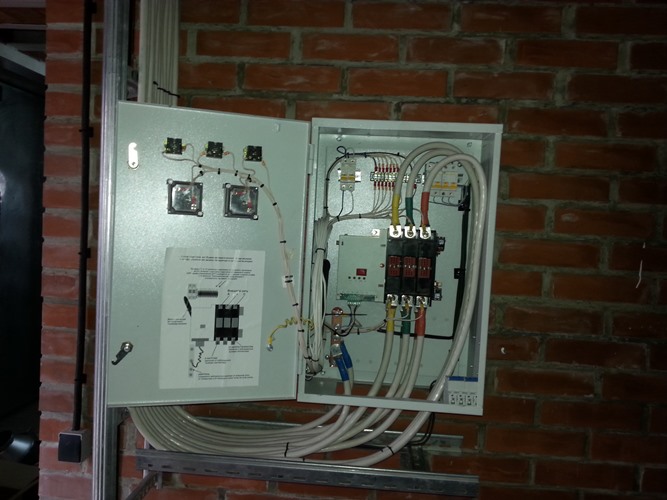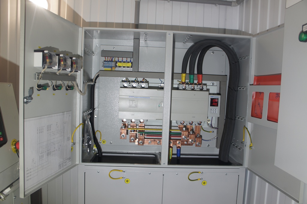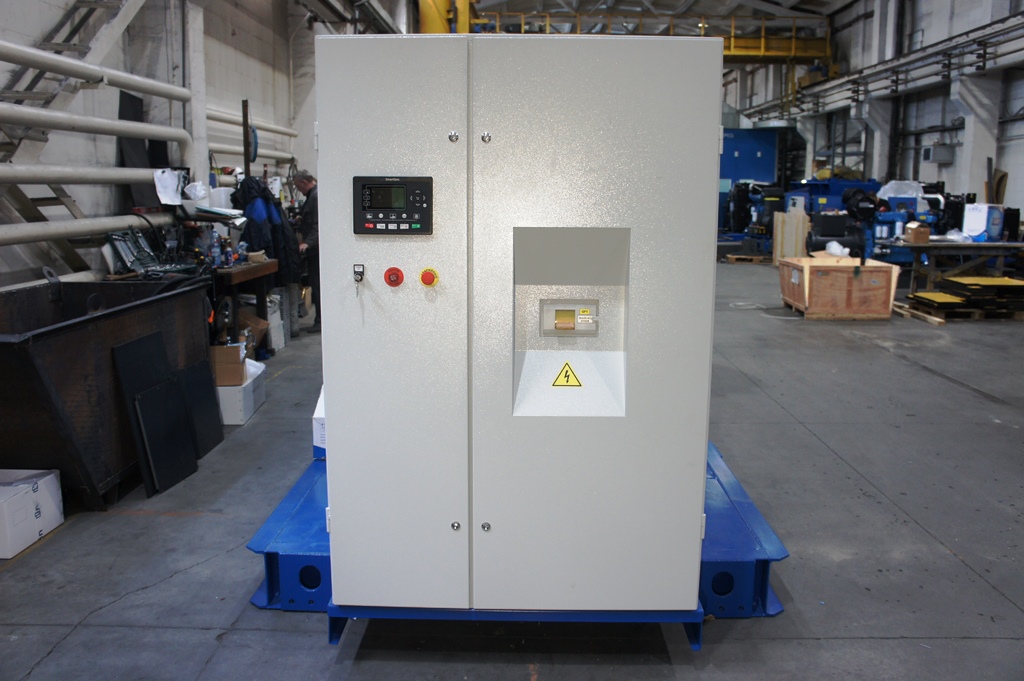 Трехфазный дизельный генератор 100 кВт со шкафом автоматического резервирования внешней сети (АВР). В данном случае мощность 100 кВт выбрана с учетом мощности электрических котлов отопления частного домовладения.