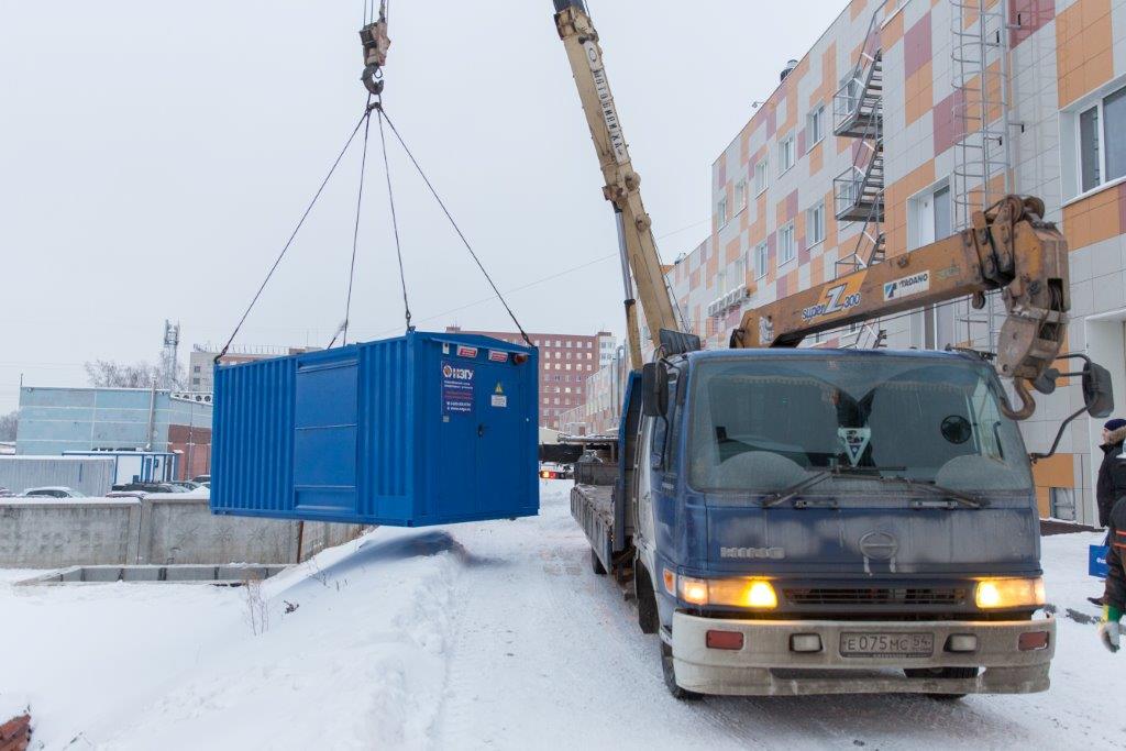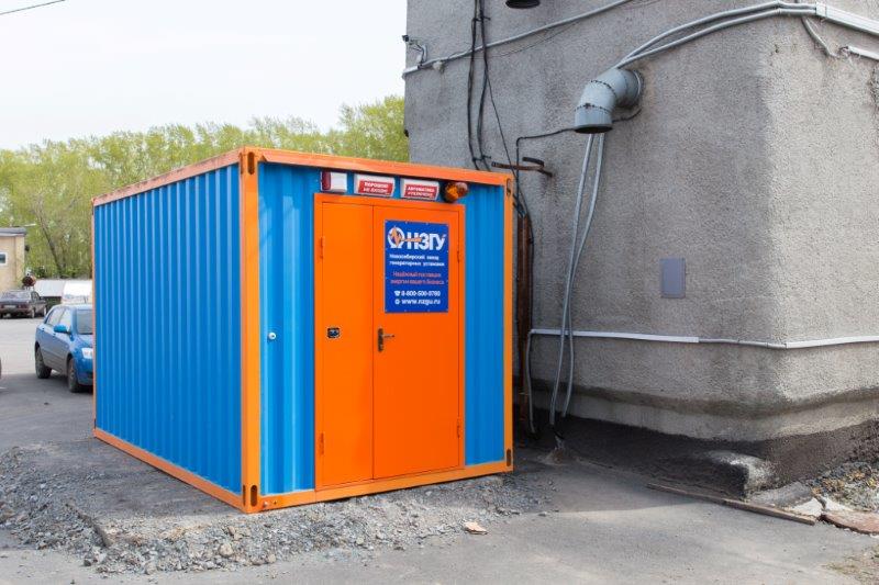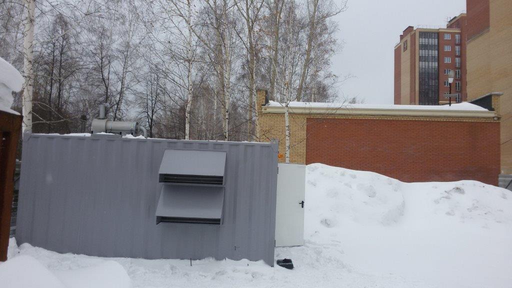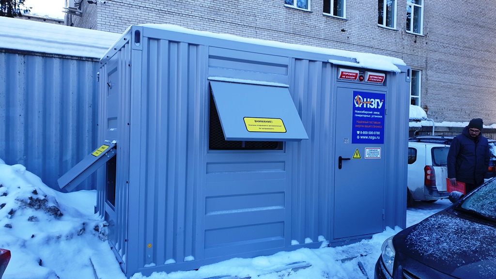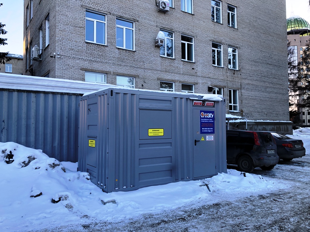 Дизельгенератор в утеплённом блок-контейнере предназначен для аварийного электроснабжения поликлиники №7 в г. Новосибирске, возведённой в рамках государственно-частного партнёрства.