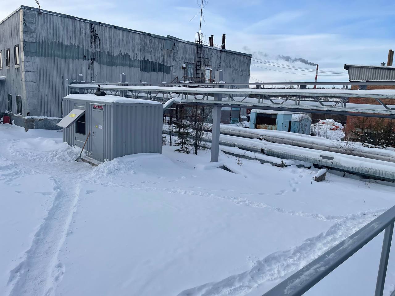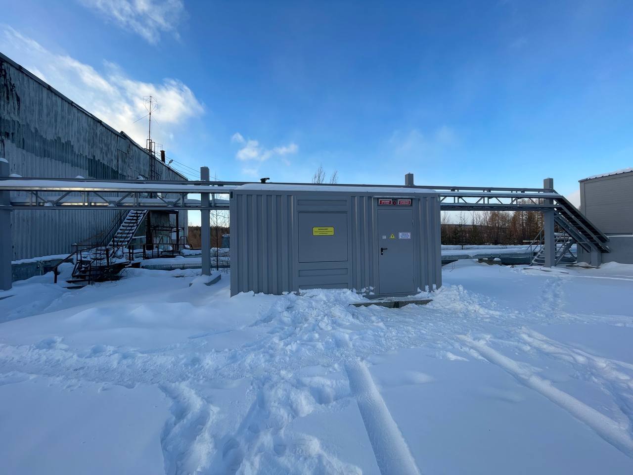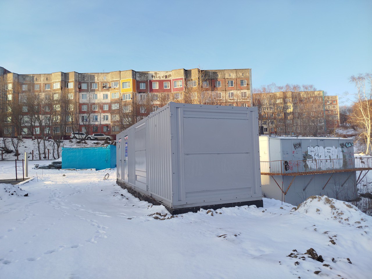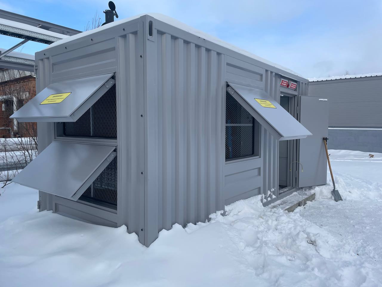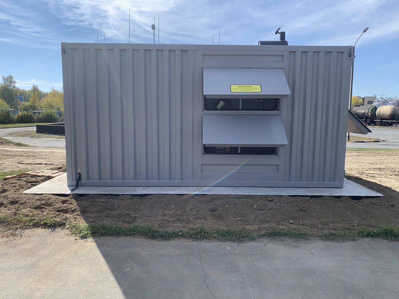 Резервный источник электропитания на базе дизельгенератора, мощностью 100 кВт в блок-контейнере типа СЕВЕР для защиты от неблагоприятных погодных условий суровой Красноярской зимы и несанкционированного доступа к оборудованию.