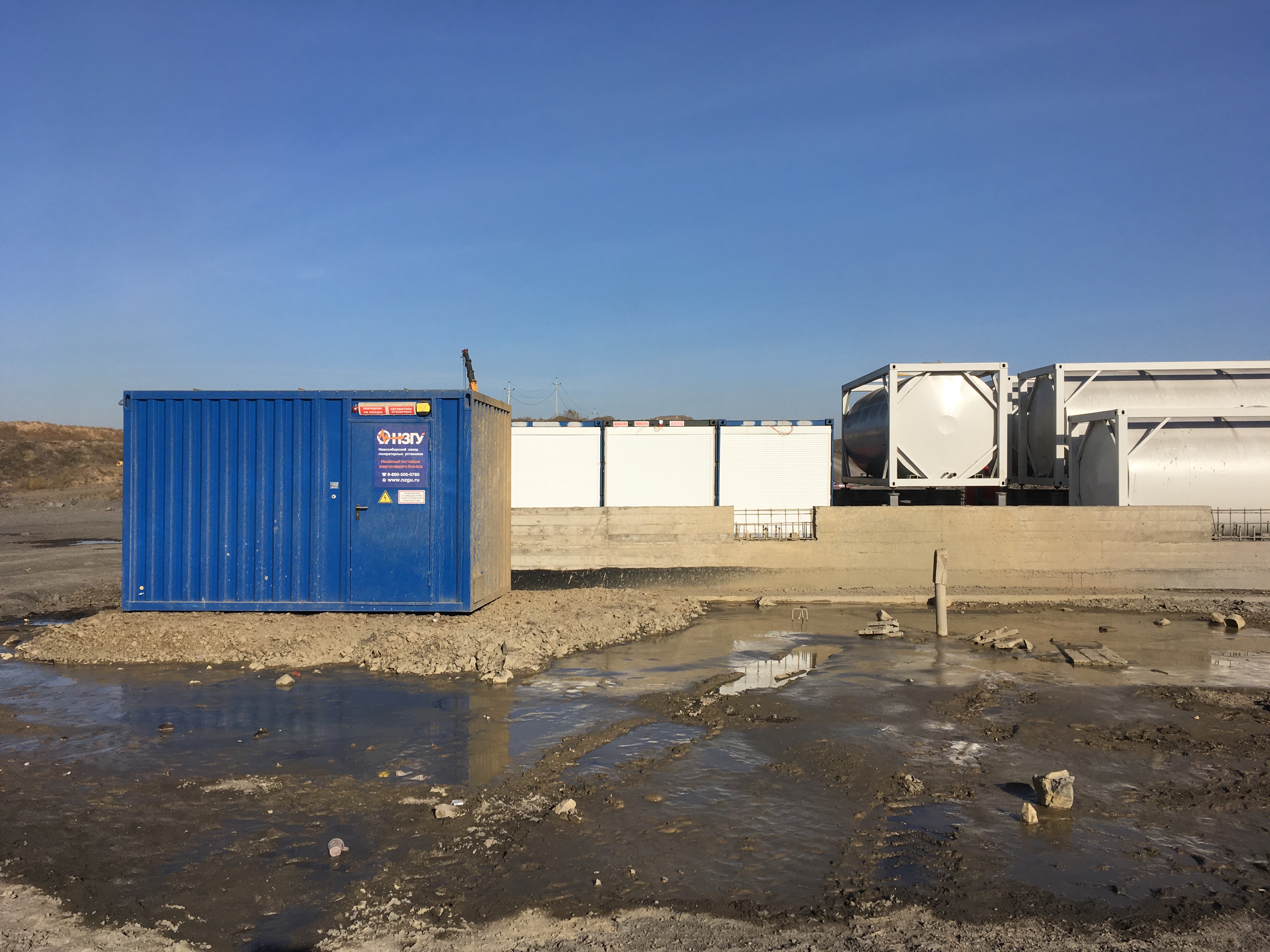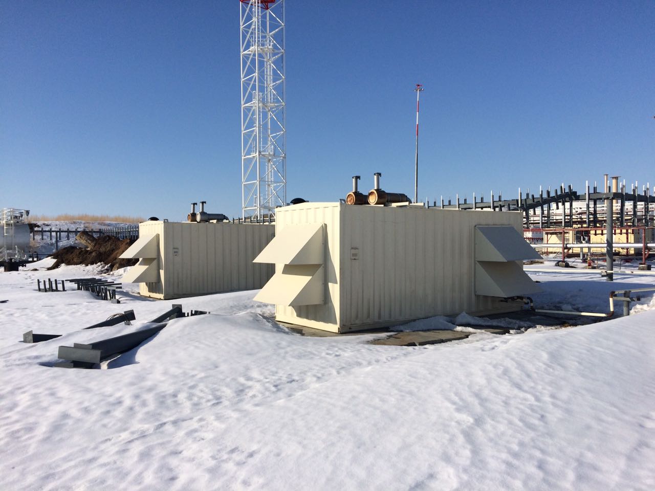 Две ДГУ по 1000 кВА на базе двигателей BAUDOUIN MOTEURS 12M26G1100 в утепленных блок-контейнерах с дополнительными топливнымми баками 5000л и ДГУ 320 кВт на базе двигателя BAUDOUIN MOTEURS 6M21G285 в утепленном блок-контейнере.