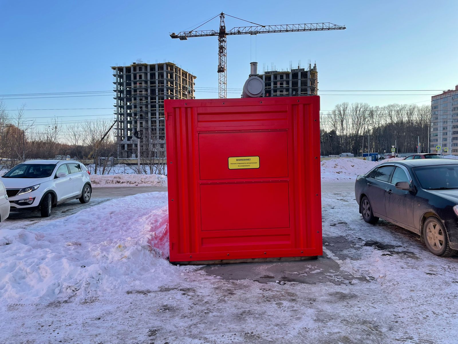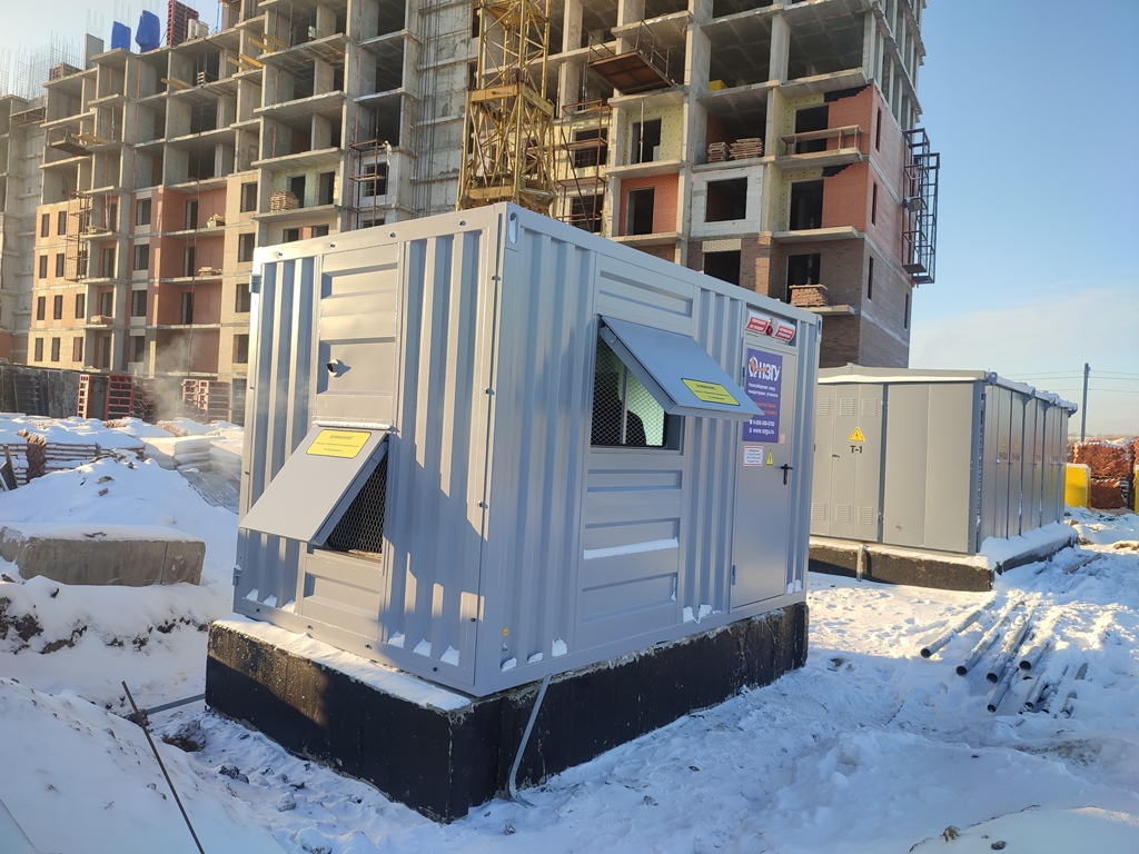 Дизельный генератор в утепленном блок-контейнере типа "СЕВЕР" установлен в строящемся жилом комплексе г. Новосибирска. Предназначен для резервного электроснабжения пожарной автоматики и сиситем жизнеобеспечения жилых домов.